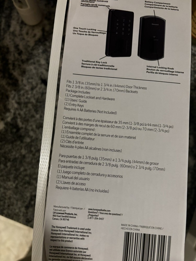 Number in Pack:1Fixings Supplied:YesANSI Grade:n/aMounting:UnknownMaterial:UnknownFeatures:Electronic, Fingerprint EntryColor:BlackItem Depth:n/aItems Included:Hardware, Instructions, KeyCountry/Region of Manufacture:ChinaMPN:8635302Model:Honeywell 8635302Throw Length:UnknownSuitable For:Front DoorStyle:n/aItem Weight:3.2 lbs all items in the boxDoor Handing:Universal/ReversibleItem Width:n/agtin13:814113013143Type:Electronic Door LockUPC:814113013143Cross Bore Diameter:UnknownBrand:HoneywellFinish:n/aItem Height:n/a