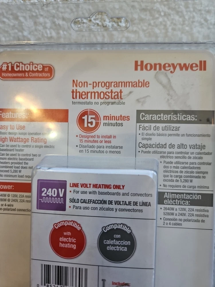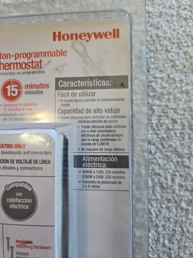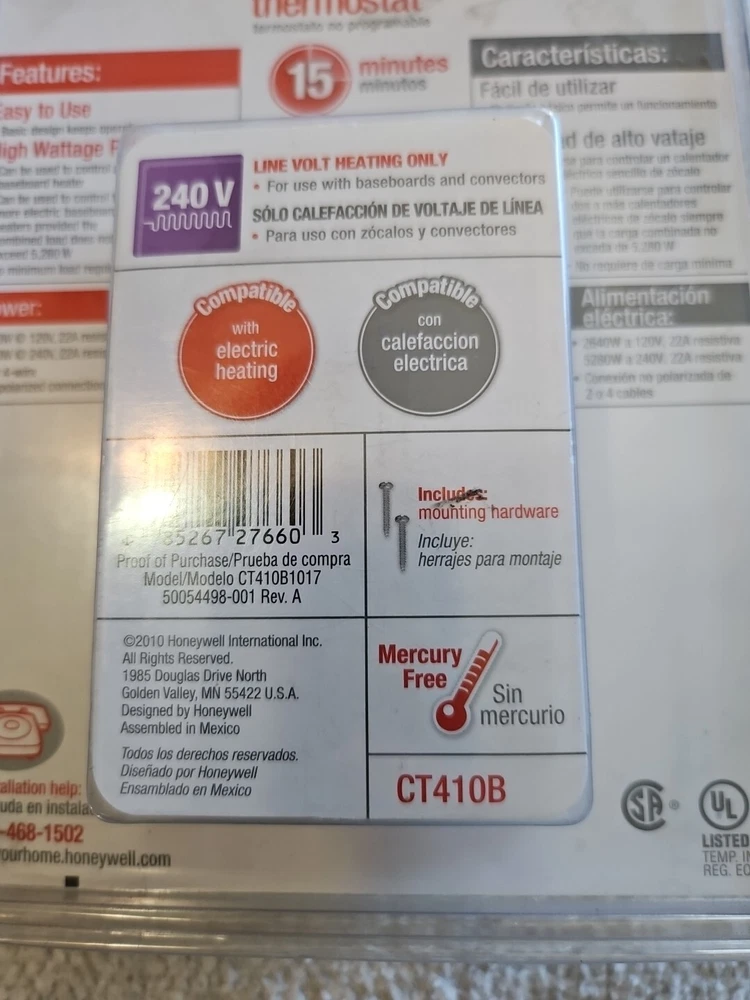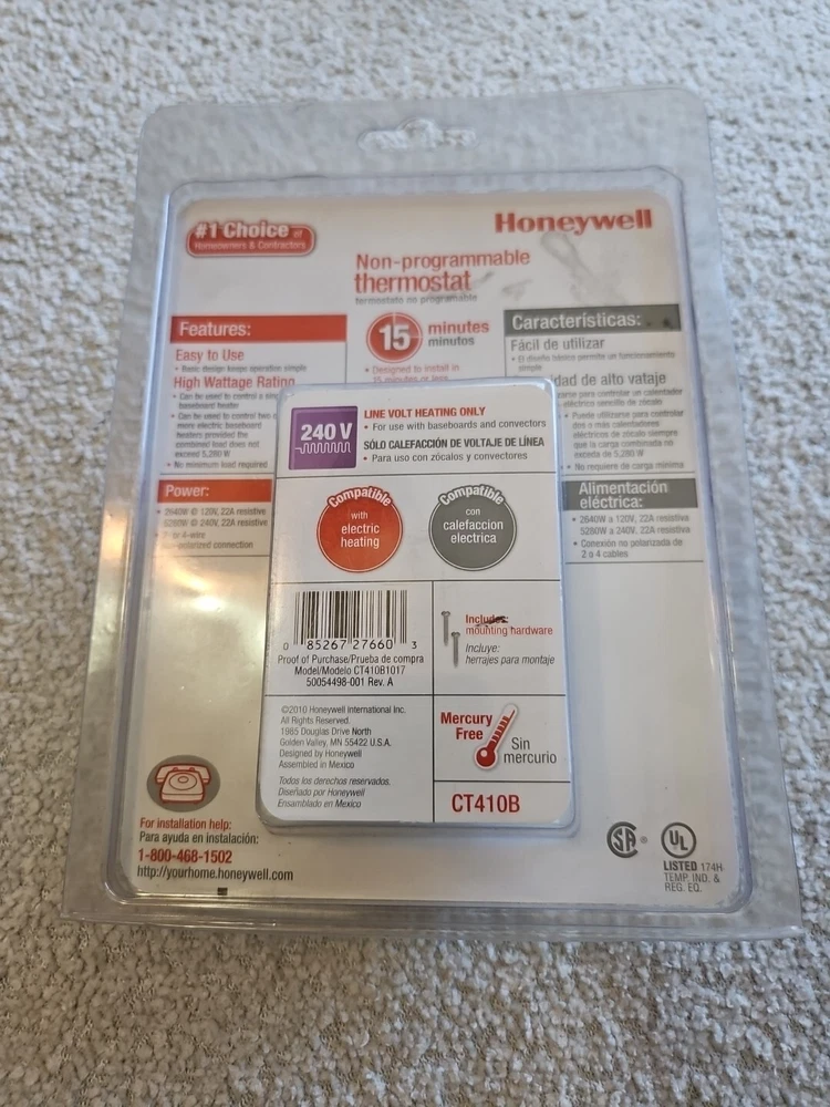 Model:CT410B1017/E1Color:WhiteBrand:HoneywellWire Configuration:4-WireSensor Technology:TemperatureUPC:0085267276603Battery Size:AAAMPN:CT410B1017/E1Display Size:1.5 in (3.8 cm)gtin13:0085267276603Power Source:Corded ElectricSmart Home Protocol:BluetoothThermostat Shape:RectangularThermostat Programmable Days:1Voltage:240 VFeatures:ThermostatControl Style:Rotary KnobMaterial:DURABLENumber of Periods per Programmable Day:4Mounting:Floor-Mounted