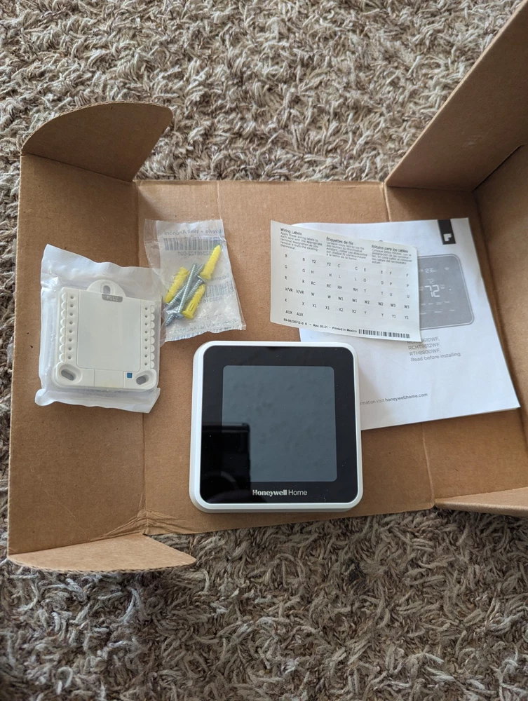 This is a brand-new open box. comes with mounting hardware and instruction manual. Great programmable thermostat to keep your home the perfect temp!