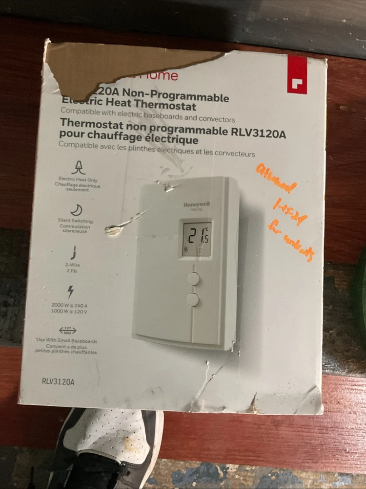 Honeywell RLV3120A1005 is a rectangular digital thermostat designed for electric baseboard heating. It operates on 240V power source and features push button control with digital display. The thermostat has a 2-wire configuration and is compatible with Powerline/UPB smart home protocol. Its white color and sleek design make it a practical and efficient choice for controlling the temperature in your home.