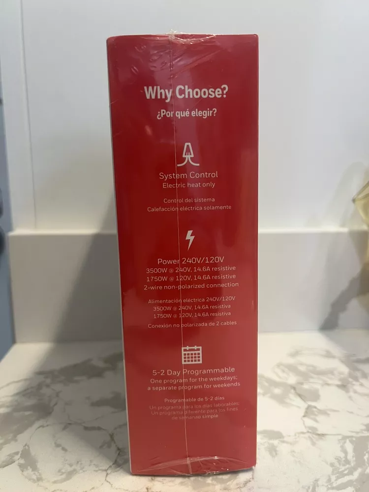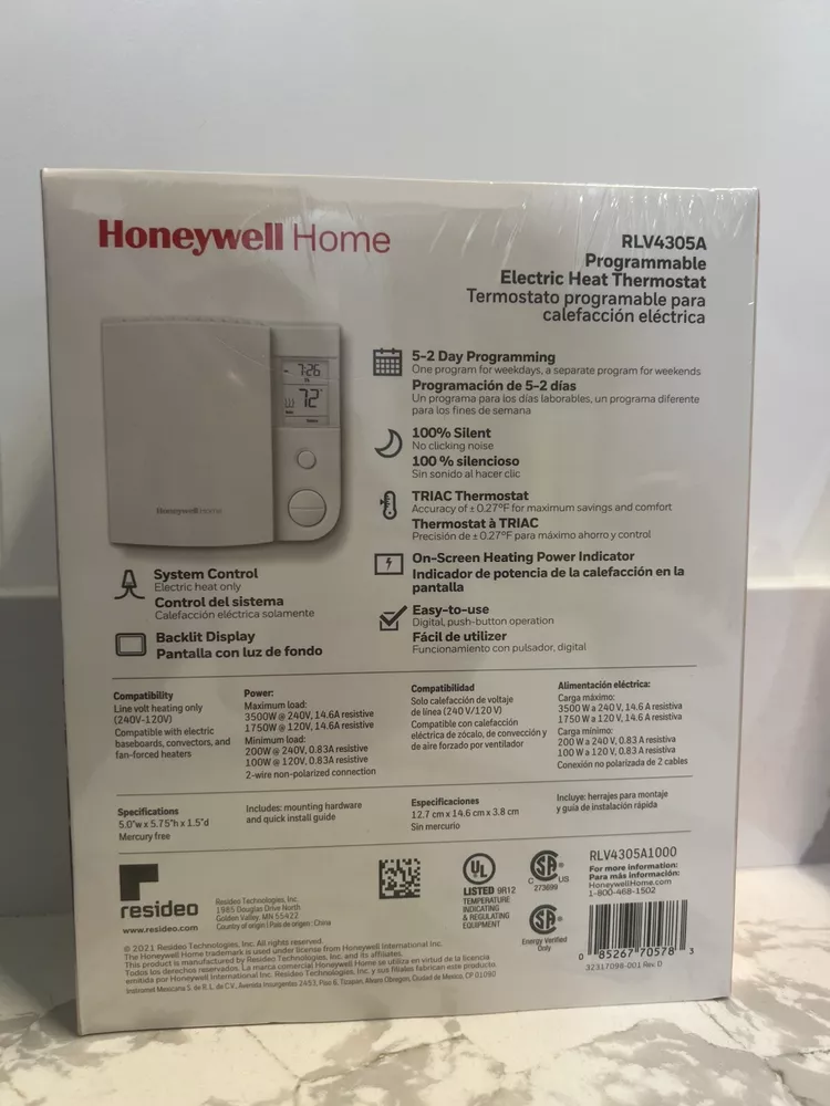 The Honeywell RLV4305A1000/E1 Corded 5-2 Day Programmable Thermostat is a white square-shaped thermostat designed for wall-mounted installation. It is programmable for 5 weekdays and 2 weekend days with 4 periods per day. This thermostat is compatible with baseboard heaters, has a digital display, and operates on 240V line voltage. It features sensor technology for temperature control and comes with switch, push button, touch, and analog/mechanical controls.
