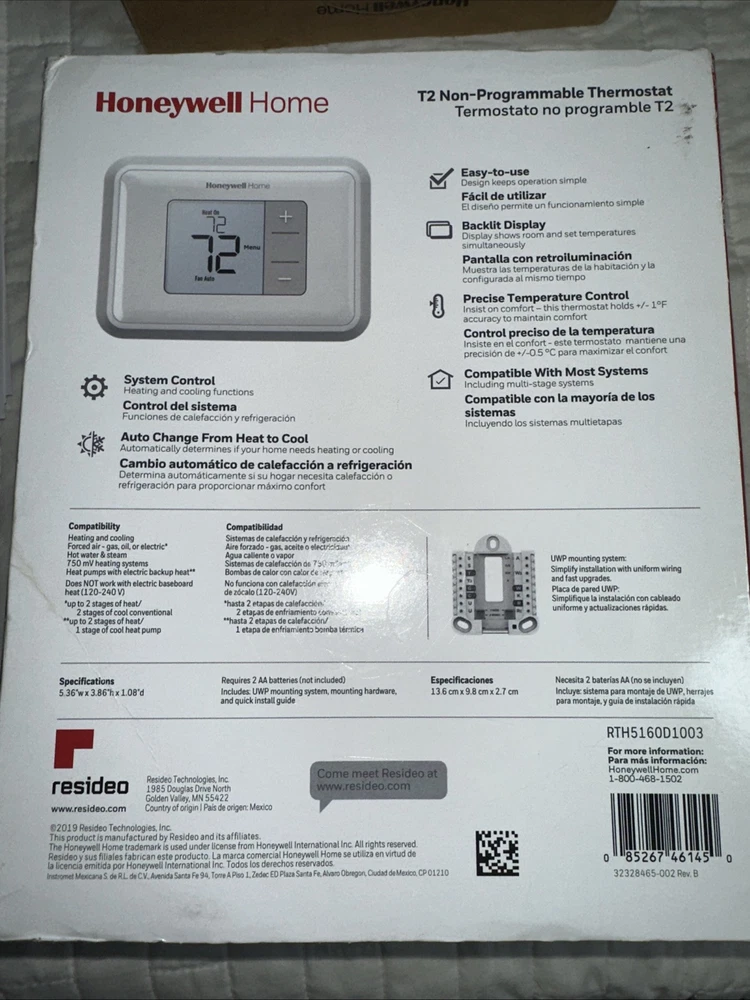 The Honeywell RTH5160 Non-Programmable Thermostat is a wall-mounted, corded electric thermostat with a rectangular shape and a 4-wire wire configuration. It features a digital display, push button control style, and temperature sensor technology. The thermostat is designed for non-programmable use with AA batteries and has two periods per programmable day. It is white in color and has a display size of 2.36 inches (6 cm). The Honeywell RTH5160 is a reliable and efficient thermostat for home heating and cooling.