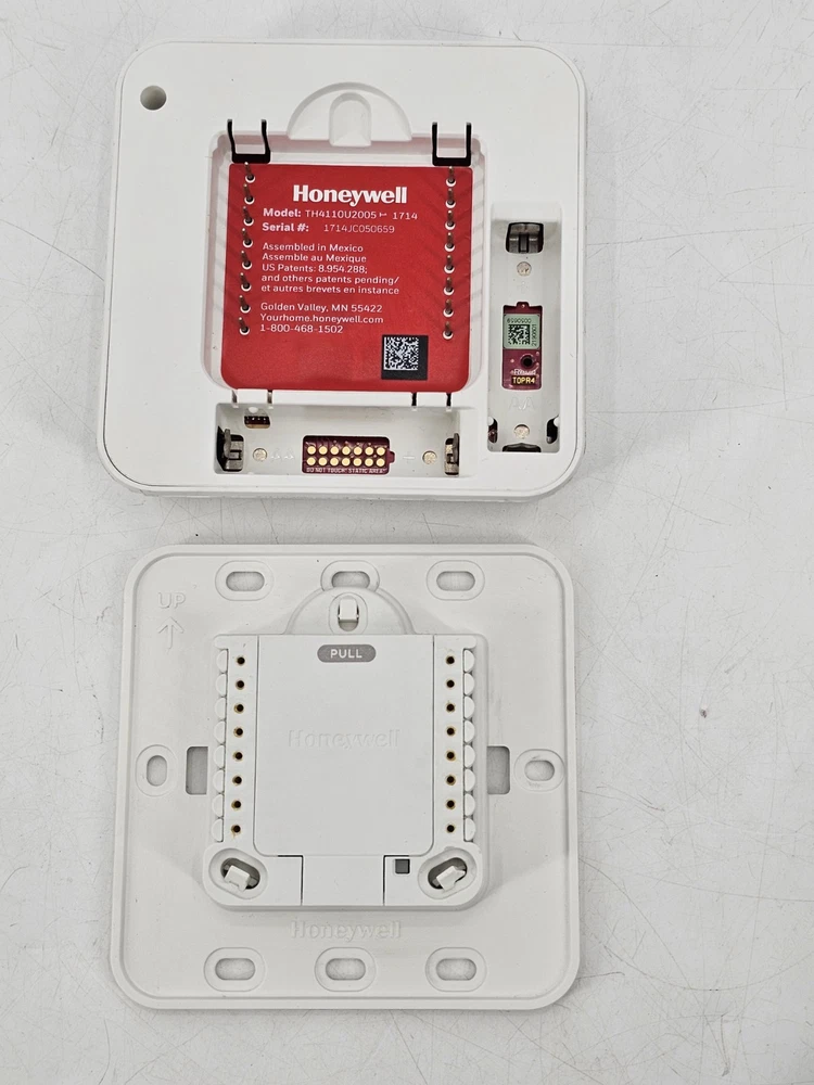 Voltage: 24 V Control Style: Digital, Push Button Heat Stages: 1 Compatible Model: Certain Honeywell Home TH4110 models. Power Source: Battery Thermostat Shape: Square Year Manufactured: 2005 Programmability: Programmable Country/Region of Manufacture: Mexico Features: Digital Display Wire Configuration: 4-Wire Thermostat Programmable Days: 7- Day Resistance Properties: Chemical Resistant System Switching: Heat-Cool-Off Model: T4 Pro Voltage Type: Low Voltage Mounting: UW Mounting Items Included: Batteries Cool Stages: 1 Brand: Honeywell Compatible Brand: Honeywell Home MPN: TH1140U2005 Battery Size: AA Color: White Sensor Technology: Temperature Number of Periods per Programmable Day: 4
