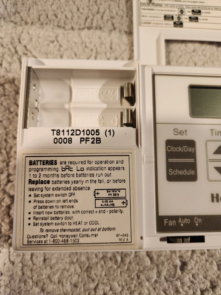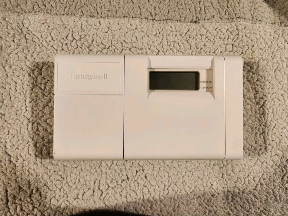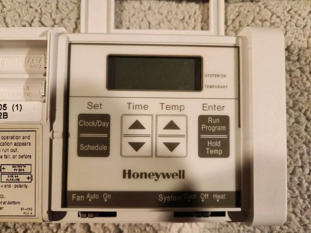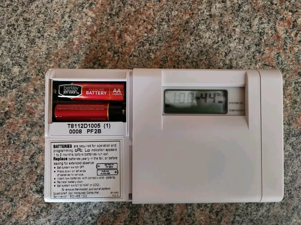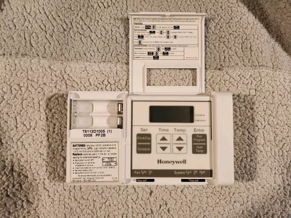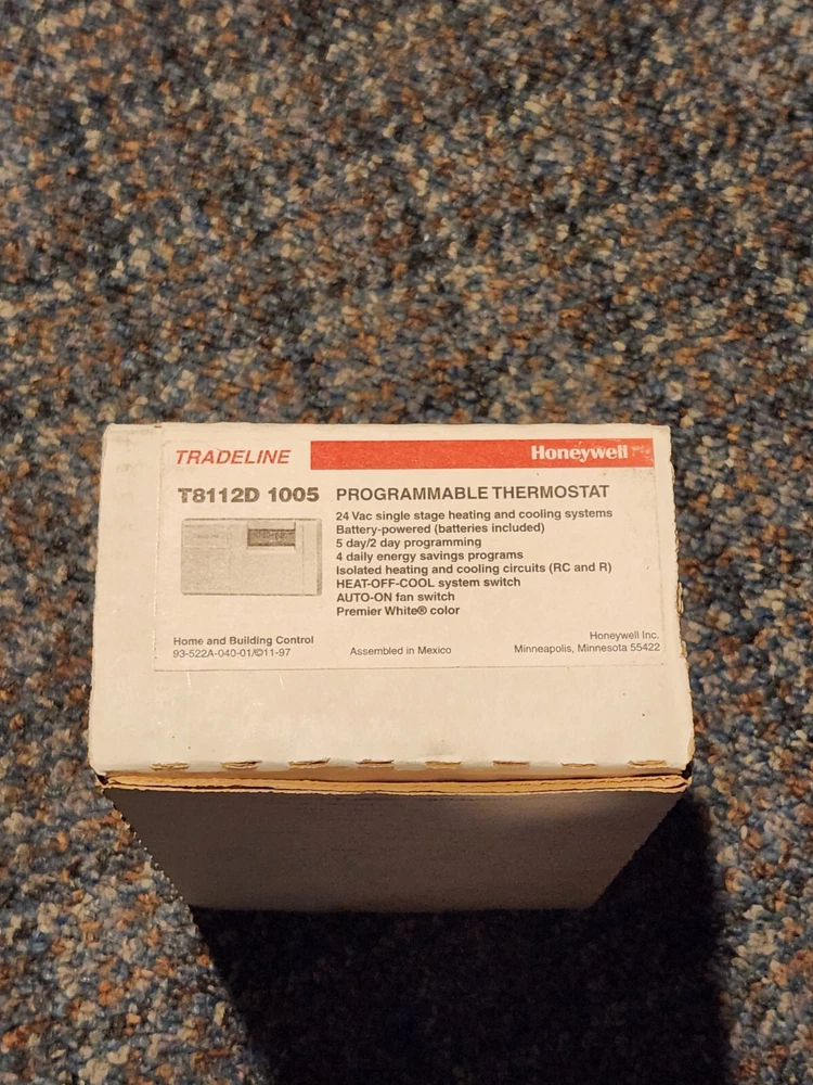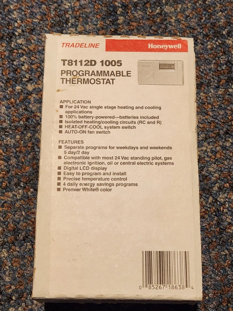 The Honeywell T8112D1005 Electronic Low Voltage Programmable Thermostat in White is compatible with Honeywell products, powered by batteries, with a 5-wire configuration. It features a digital display, temperature sensor technology, programmable settings with 4 periods per day, and control options including switches and push buttons. This thermostat is wall-mounted and suitable for heating and cooling systems, with smart home compatibility. Like new but box is worn as shown. Batteries are not included.