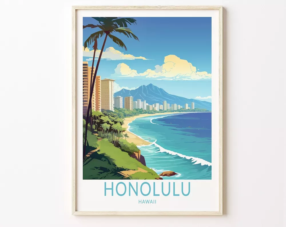 Honolulu Hawaii Travel Print Hawaii Travel Art Wall Decor Honolulu Hawaii Home Decor Wall Art City Travel Poster Gifts Home Decor Material: Premium luster photo paper Print type: Inkjet printing One side printed + The finish provides the highest possible resolution and color saturation + Lasts up to 200 years in color and 400 years in black-and-white + Printed on high-quality resin-coated photo base paper medium + Posters can be hung with double-sided tape, tacks, or framed + Hand washing with a gentle cry cloth is recommended for extended durability I will hand select the best choice of paper for your chosen design to ensure top quality results for a beautiful, bright and luxurious print. All prints are sealed in cellophane slips for protection during transportation, and are shipped in a protective cardboard envelope.