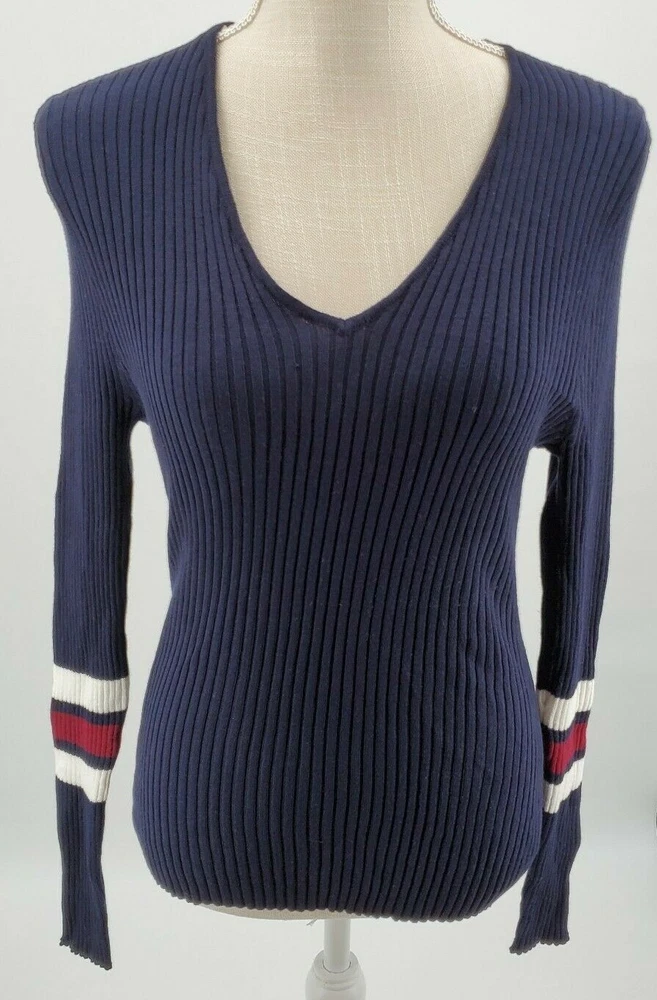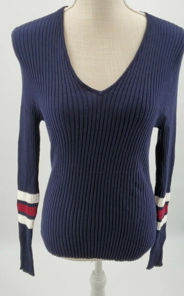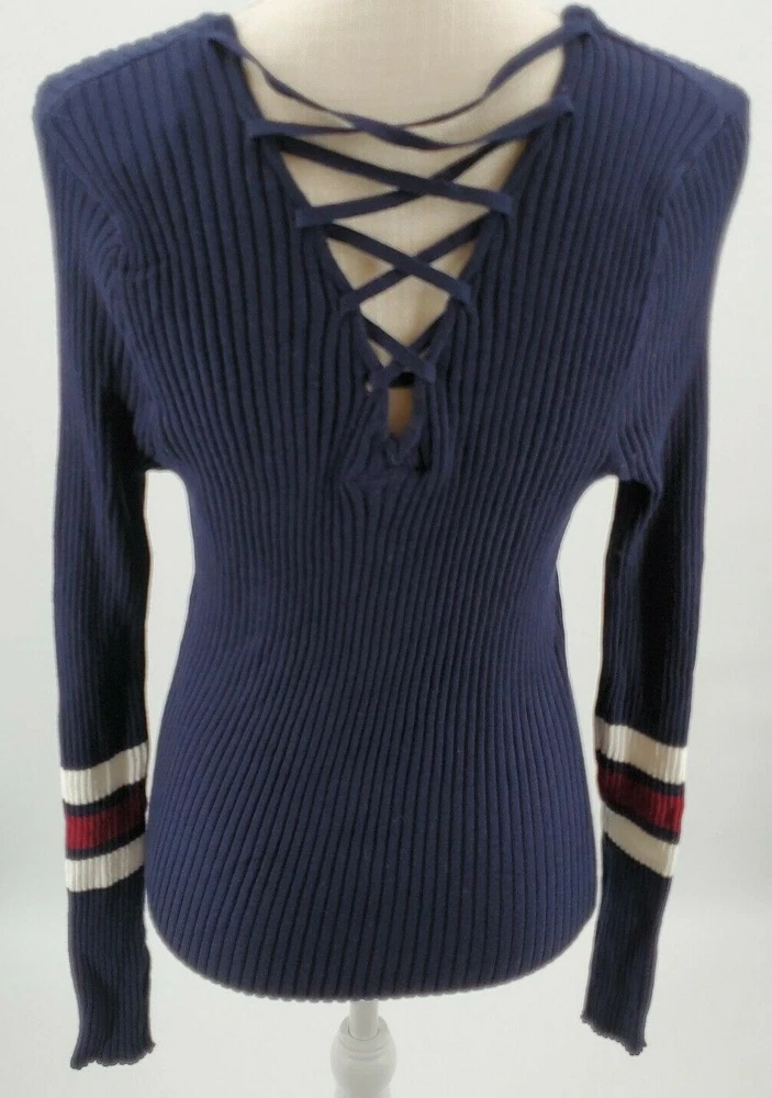 Hooked Up By IOT Lace Up Back Navy Varsity Striped Sweater Juniors Size XL Lace Up Back Long Sleeve V Neck Varsity Stripe Sleeves Stretchable Knit Ribbed Not Stretched Armpit to Armpit: 13 Inches Not Stretched Length: 24 1/2 Inches What is a shelf pull? Shelf pulled items are items that have been displayed in retail stores for sale but never been purchased by a customer. They have been in a retail environment and may have been handled during this process. Every order placed Monday through Friday (business days) will ship out next day! We are always available to answer any questions you may have and can offer more photos if needed! Return Policy: You will have 30 calendar days to make a return on your item. Items MUST be returned in original condition that they were sent as in order to receive a full refund. If items are damaged or were new with tag and no longer have tags attached they will be either non refundable or you will be given a partial refund.