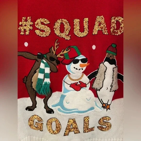 Character Family:Reindeer, Snowman, PenguinVintage:NoGarment Care:Machine WashableColor:RedFeatures:Graphic PrintSleeve Type:RegularPattern:Reindeer, Snowman and PenguinClosure:PulloverCountry/Region of Manufacture:ChinaFit:RelaxedNeckline:Round NeckDepartment:WomenGraphic Print:YesAccents:SequinUPC:Not ApplicableStyle:PulloverSeason:WinterFabric Type:KnitMaterial:AcrylicSize:Sgtin13:Not ApplicableOccasion:Party/CocktailTheme:ChristmasBrand:Hooked Up by IOTSize Type:RegularType:SweaterSleeve Length:Long SleeveKnit Style:Tight-Knit