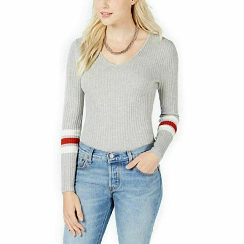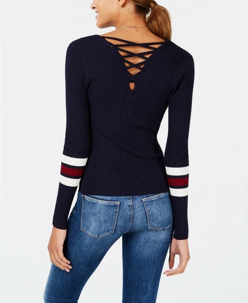 PRODUCT DESCRIPTION. !!!!!PICTURE #3 IS AN EXAMPLE OF THE BACK OF SWEATER!!!! In this ribbed sweater from Hooked Up by IOT, it's the V-back that calls for attention with lace-up detailing for a sweet and stylish turn. Varsity stripes at the sleeves add a sporty-chic vibe in this pullover number. Hits at hip V-neckline Lace-up detail at back; ribbed throughout Varsity stripes at long sleeves Rayon/polyester Machine washable Imported We happily will accept returns for UNUSED items We will accept returns within 30 days from the date of receipt of product. Refunds will be given in the same manner item was purchased (minus shipping cost to buyer). Buyer is responsible for return shipping. All listings are described to the best of our knowledge. If you have any further questions please contact us before purchasing the item. Please, contact us if you have any problem with an item before opening a return request/ other case. We will try to solve the problem.