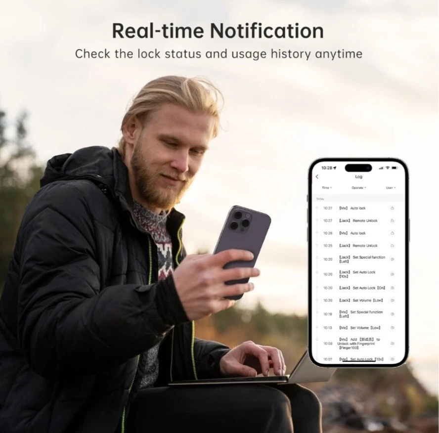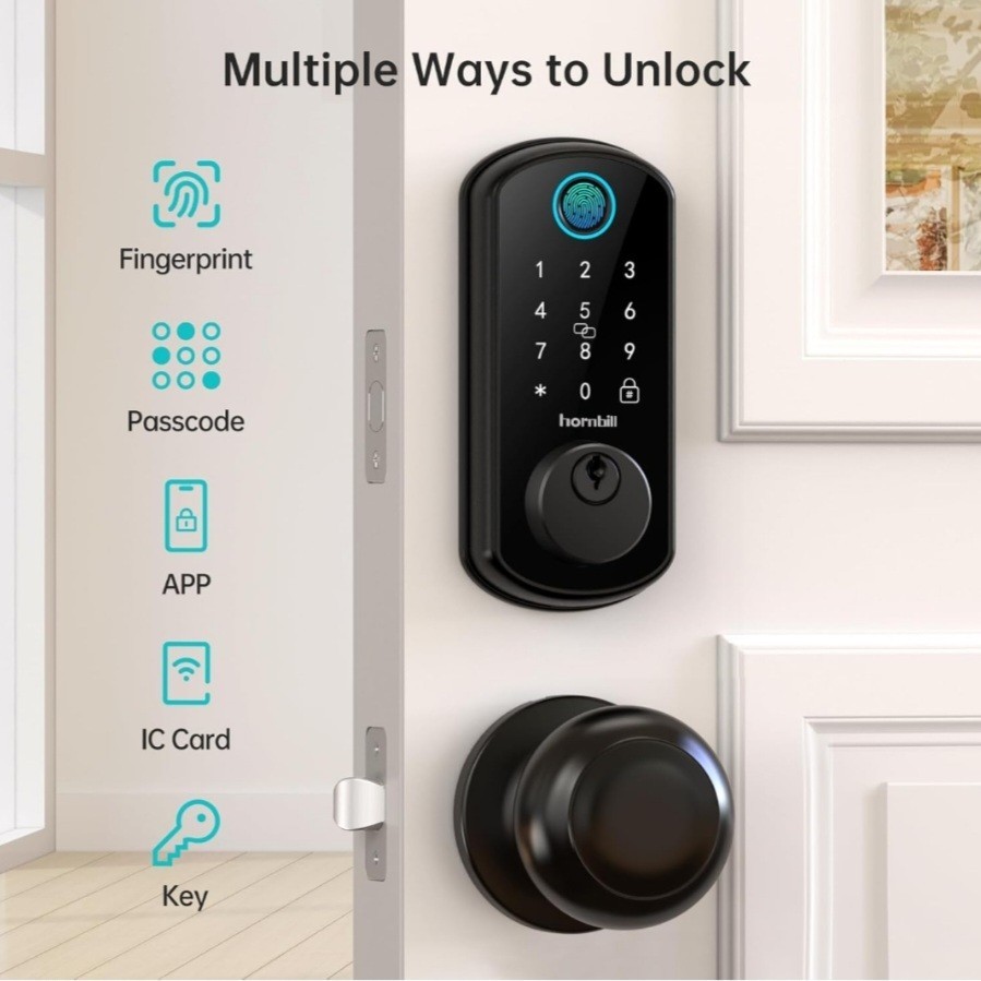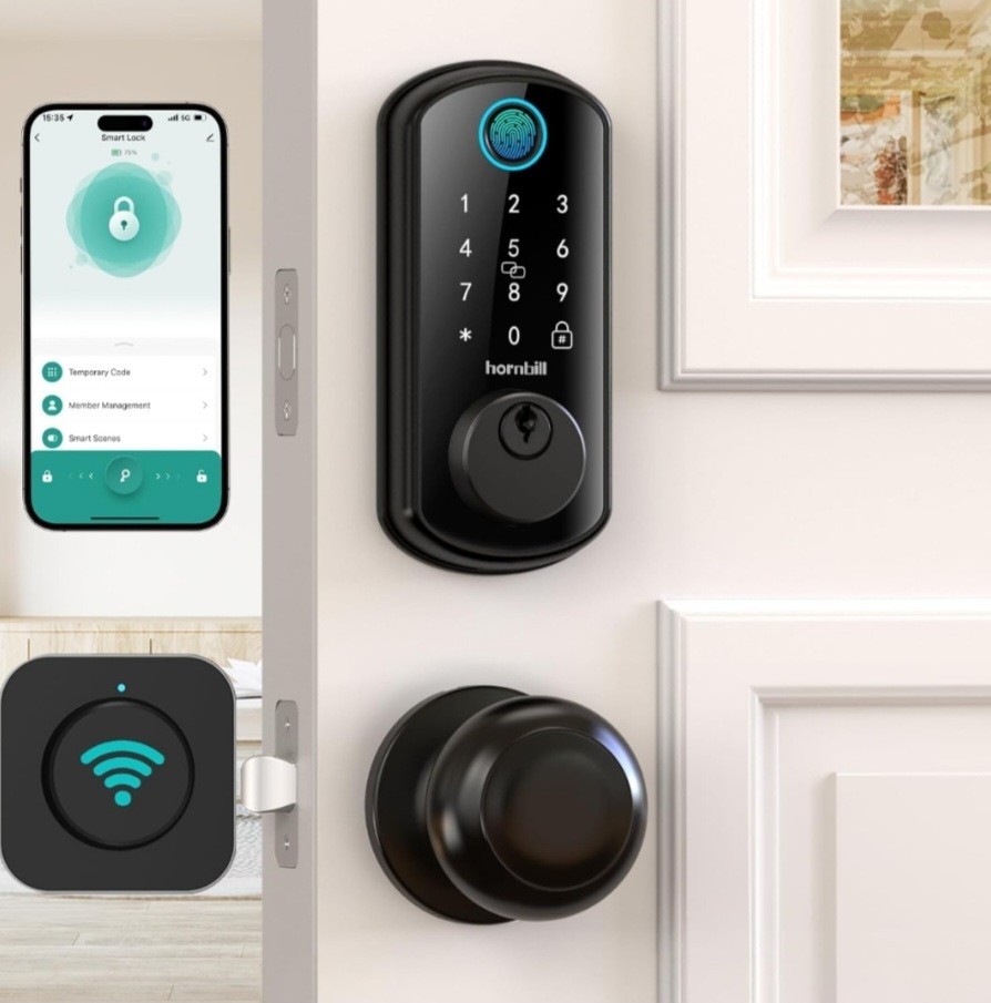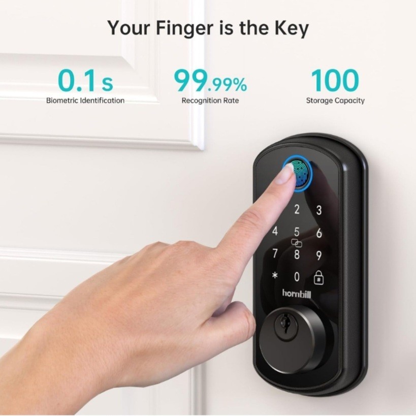 This is a modern Hornbill Smart Keyless Finger Entry Door Lock suitable for your front door. It is made of high-quality aluminum material with a brushed finish. The lock is easy to install and features wifi capability, making it convenient for you to access your home. The lock is designed to provide security for your home and is perfect for those who want a modern and sophisticated look for their front door.