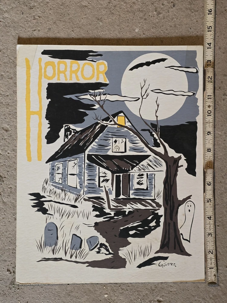 For your consideration is this silkscreen on Cardboard art print. Signed Gunster. Horror themed with a haunted house, ghost, graveyard, and topped off with bats. A piece of tape adornes each top corner. Small crease. From the Jim Sotet collection. Sotet was a Mercury Records Executive from the 1970s until his retirement in the mid 2000s. See photos for exact item condition and measurements. Check out our ebay store for more rare and rad collectibles!