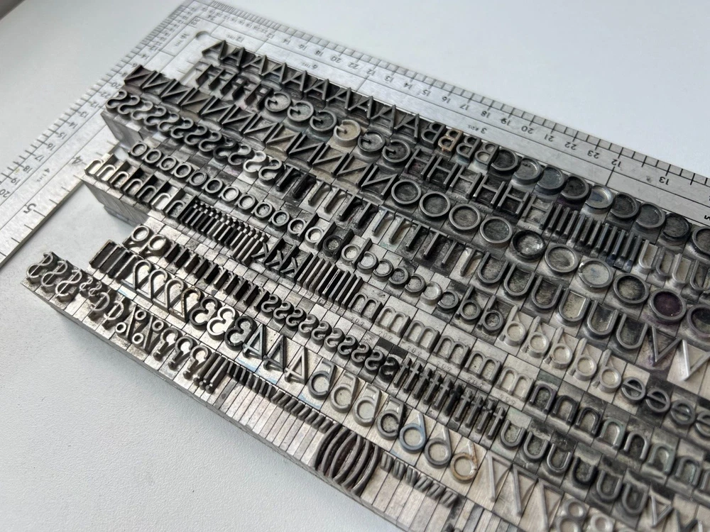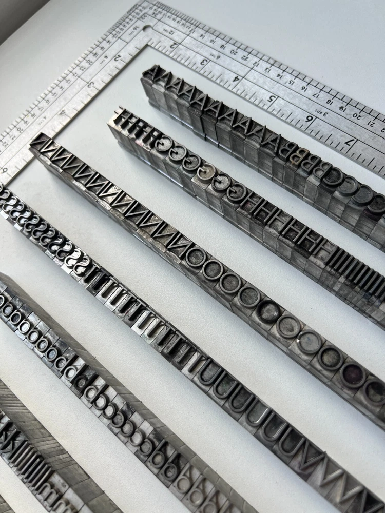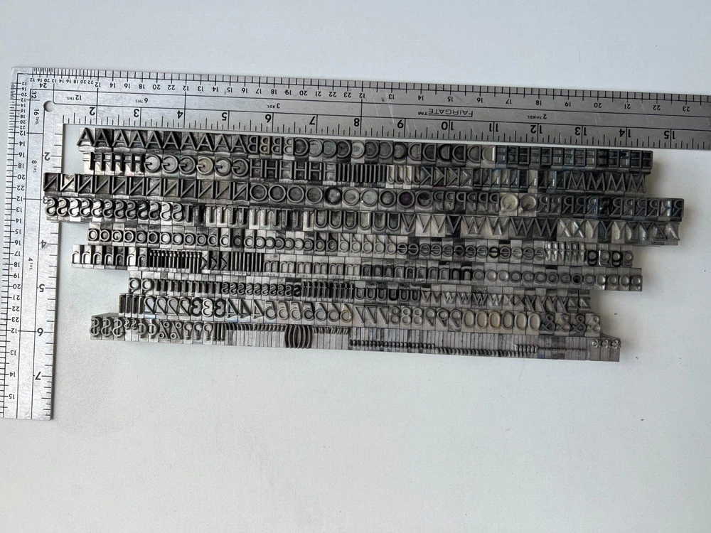This is a huge, expansive set of letter press dies for hot stamping machines like Kingsley or Kwikprint. I believe this is size 36, as that's what it says on the box I received them in, but I cannot guarantee exact point size. Please use photos for reference on actual sizing. Includes (as shown in photos): Upper Case Lower Case Numbers Punctuation Please see photos for complete condition. Some letters may have oxidation or discoloring from foils. Please ask with any questions.