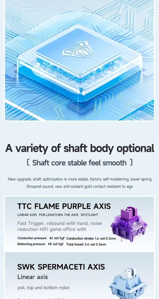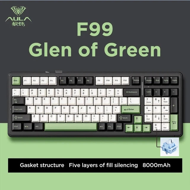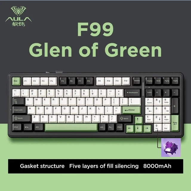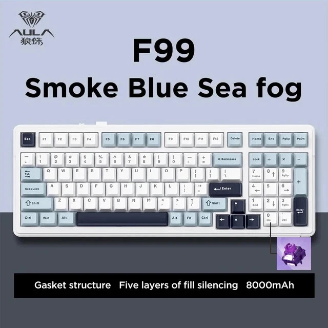 • Mechanical Operation : Experience seamless gaming with the Aula F99 Mechanical Keyboard, designed for gamers who demand high performance and responsiveness. • Bluetooth Wireless Connectivity : This keyboard offers Bluetooth wireless connectivity, ensuring you can game uninterrupted whether you're using a PC or a laptop. • Three Modes : The Aula F99 comes with three modes - wired, Bluetooth, and hot swap, giving you flexibility and convenience in your gaming setup. • PBT Gasket RGB : Equipped with PBT gasket RGB, this keyboard not only delivers superior comfort but also adds a stylish touch to your gaming setup. • 98 Keys Standard : With its 98 keys standard, this keyboard provides a complete typing experience, making it perfect for both gaming and office use. • Multilingual Support : The keyboard supports English, Chinese, and other languages, catering to a global user base. Multi-Device and Tri-Mode Wireless Connectivity: Bluetooth 5.0 & 2.4G & Type-C Cable AULA F99 supports USB wired, 2.4G wireless and Bluetooth 5.0 connection,a convenient and versatile option for users who use multiple devices and want a keyboard that can easily switch between different modes.It‘s compatible with Laptop, iPad, IOS, Windows, Mac or Android. No fussy connection process!An indicator light on the right side of the keyboard shows the state of the battery. Grey wood Switch Shaft Material:POM Shaft Type:Linear Shaft Total Stroke:3.6-0.3mm Initial pressure:30 gf Min Conduction stroke:1.50.3mm Conduction pressure:40±3 gf Bottom pressure: 53±3 gf Mechanical life: approx. 60 million cycles Nimbus V3 Switch Shaft Material: POM Shaft Type:Linear Shaft Total stroke:3.7±0.3mm Initial pressure:28 gf Min Conduction stroke:1.3±0.3mm Conduction pressure:34±3gf Bottom pressure:45±3gf Mechanical life: approx. 60 million cycles AULA F99 Mechanical Keyboard Specification: -Connection: Type-C wired & 2.4G Wireless & Bluetooth - Keys: 99 keys -Hot swapable: 3-pin/5-pin hot-Exchange - Backlight: RGB Back Light - Profile: Cherry profile -Product size:390.63X146.78 × 42.57mm - Product weight: Approx.1132g (without cable/receivery/Approx.1183g (with cable/receiver) - Rated Voltage:DC 3.7V(Full 4.2V) - Capacity:8000mAh(2*4000mAh) rechargeable Li-ion Battery - Charging Voltage/Current:DC 5V/= 830mA - Rated current: 150mA @3.7V (default light effect)/20 mA(off all lights) - Endurance:Approx.53 hours (default light effect)/Approx.400 hours (all lights off) - Operating system: WIN XP/7/8/10/Android/IOS/MAC - with software Gasket Structure with 5-layer noise reduction F99 is a high-end gasket-mounted keyboard with a PC plate. The keyboard also has a 5-layers premium silicone pads and noise reduction cotton to reduce 95% hollow noise,abosord typing noise,and enhance the unique soft and comfortable rebound of the Gasket structure. RGB backlight & Programmable software AULA F99 has multiple RGB backlit modes that you can easily switch with simple shortcuts. You can make your RGB effects with the included software. With the software, all kinds of keyboard key functions could be set, macro recorded, and personalize your function keys as you wish. The onboard flash memory unit could save the configuration to the keyboard if offline. Large capacity battery,excent endurance AULA F99 equipped with built-in 8000mhA capacity lithium battery, which can be charging through the Type-C cable while using in wired mode. When fully charged, it lasts 53 hours with the lights on, and about 400 hours with the light off. Cherry Profile PBT Meterial Double Shot Keycaps PBT keycaps is much higher than ABS material in durability, and the surface will not be shiny after long-term use, bringing a comfortable operating experience. Hot Swappable PCB, Compatible with 3Pin/5Pin Switch F99 is equipped with hot-swappable PCB to ensure free replacement or change of switches. It is compatible with most 3-pin and 5-pin mechanical switches. Pre-installed the pre-lubed custom switches providing unrivaled tactile responsiveness with up to 50 million keystroke lifespan. Side features designed for easy switching The three-mode switching and receiver storage slot are located above the keyboard. Side switching does not require flipping.which is simple and elegant. Height adjustable, to perfectly fit your comfort. With two-stage adjustable foot support design,you can autonomously adjust the bottom with non-slip rubber pads at the bottom of theinput angle of your preference, bringing a more stable use experience.