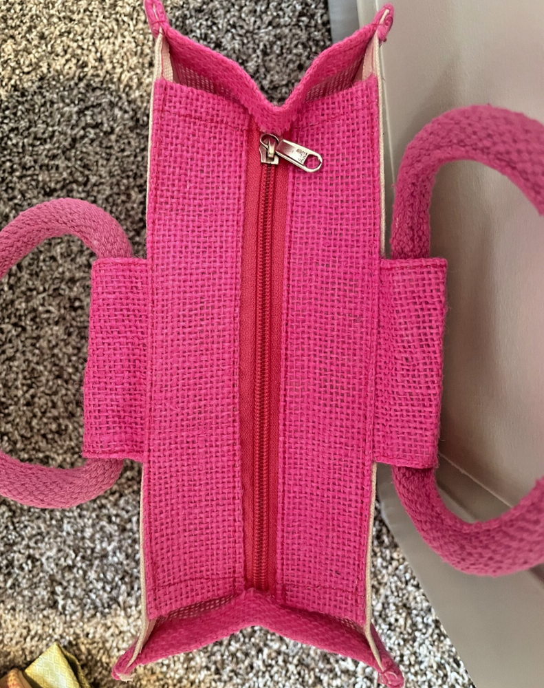 Unleash your vibrant side with this hot pink canvas tote, a playful addition to your accessory collection. Designed with a bold pattern featuring people, this medium-sized bag measures 11 inches in height, 10 inches in width, and 5 inches in depth, providing ample space for your essentials. The double handle design ensures comfort and convenience for effortless carrying. Crafted in India, this tote boasts a secure zip closure to keep your items safe, while the unlined interior maintains a lightweight feel. The exterior's durable canvas material stands up to daily use, complemented by a lively hot pink color that makes a statement with every outfit. Whether you're running errands or enjoying a day out, this tote is a versatile companion for the stylish woman on the go.