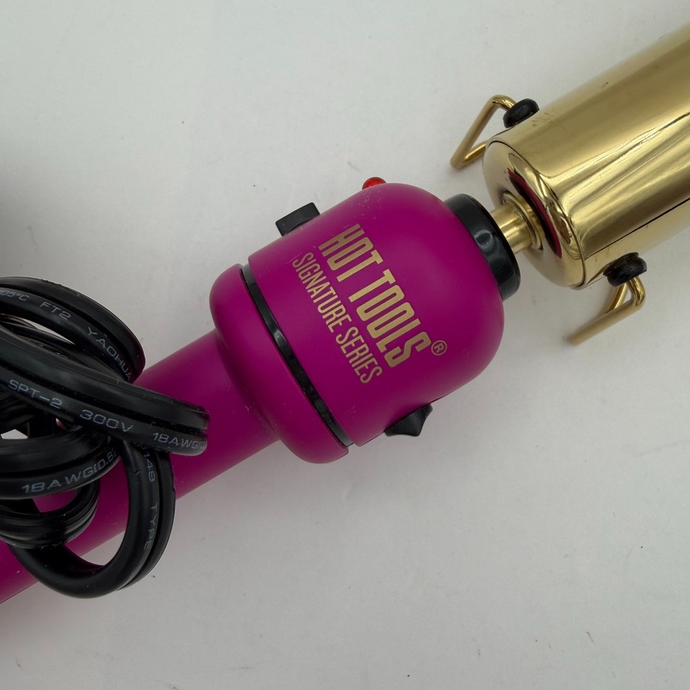 ✨ Hot Tools Signature Series 1¼" Gold Curling Iron – Pink ✨ This listing is for a Hot Tools Signature Series 1¼-inch curling iron featuring the iconic gold barrel and vibrant pink handle. Fully tested and works properly with adjustable heat settings. 🧿 Condition • Light cosmetic wear from normal use • Minor scratches/marks near indicator light (see photos) • Tested and heats up as expected • Please review all photos for exact condition 📏 Measurements • Barrel Size: 1¼" • See photo set for full tool length and cord details. 📦 Shipping Ships carefully padded to protect the tool in transit. 💛 Thanks for supporting our small family business!
