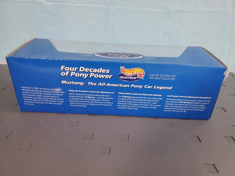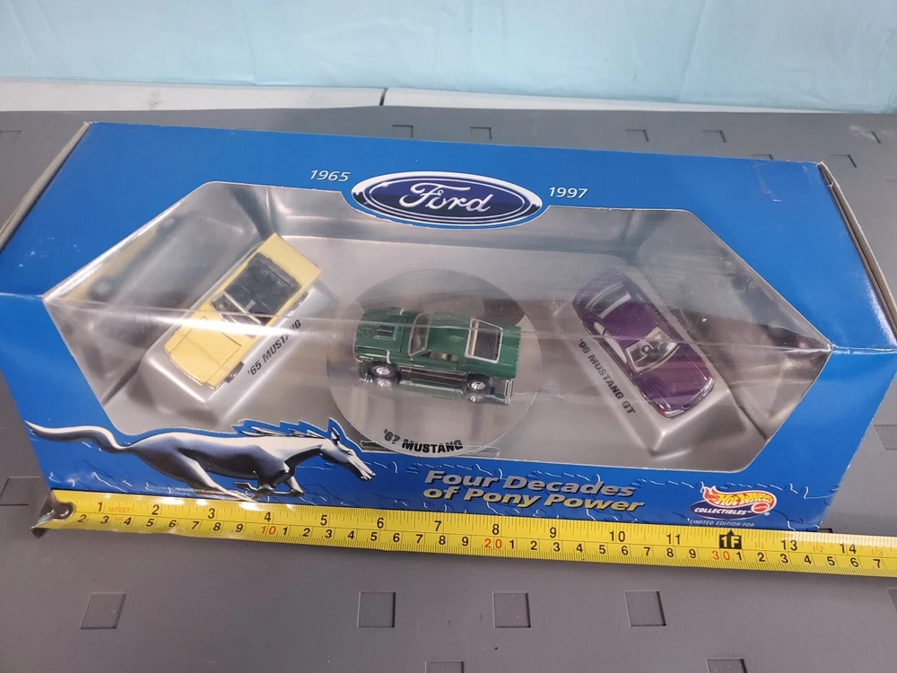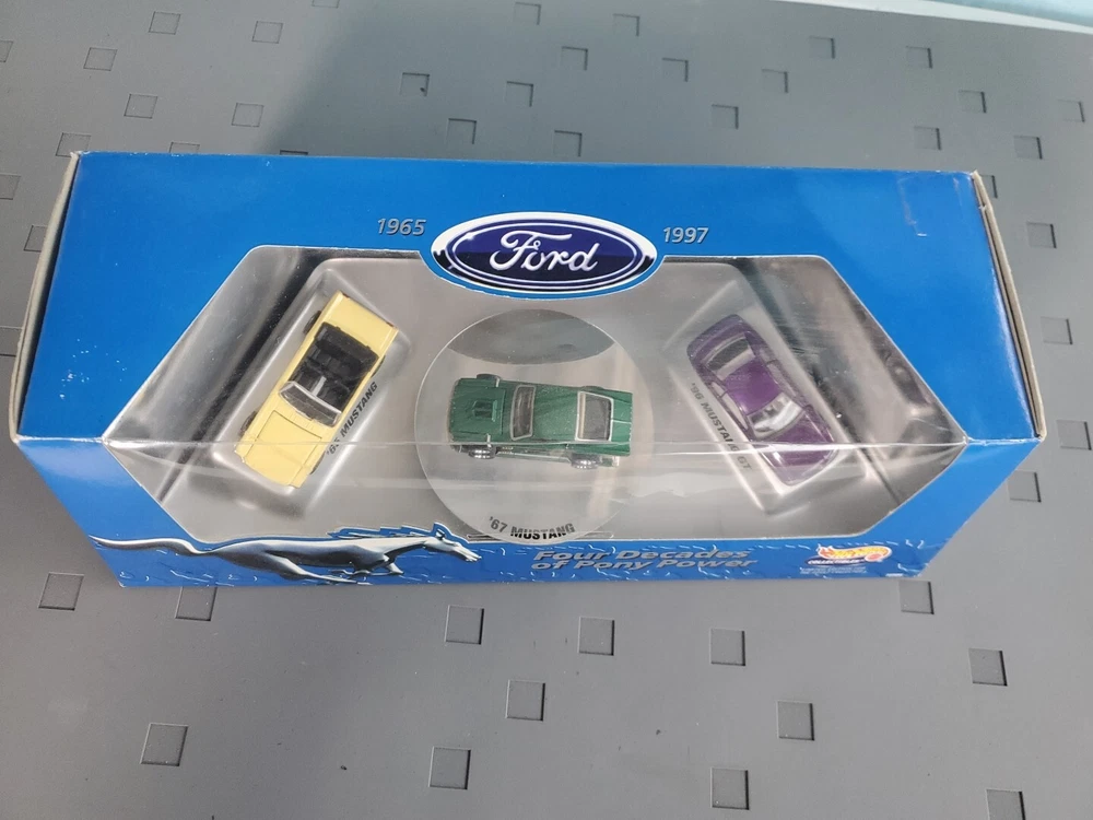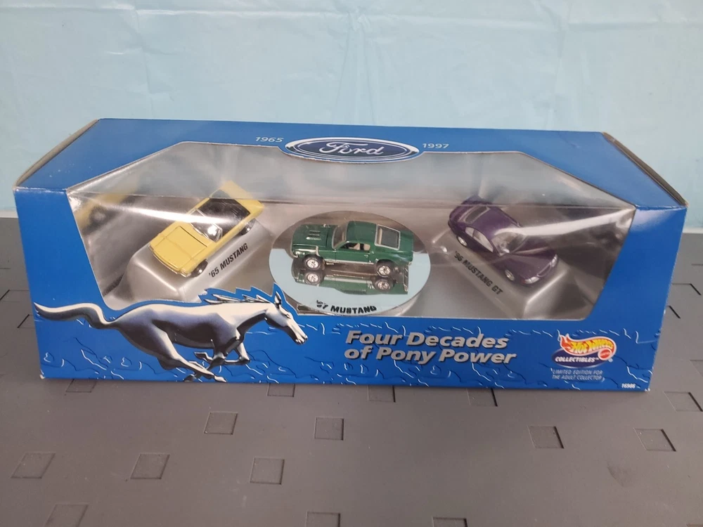 The Hot Wheels Collectibles Four Decades of Pony Power 3-Car Mustang Set features diecast Ford Mustang cars in a 1:64 scale, representing the years 1965, 1977, and 1997. These limited edition cars are part of the Ford series and come in a multi-color design. The set is recommended for ages 14 and up and is an unopened box, making it a valuable addition to any collector's display. Ideal for both boys and girls, this collectible set celebrates the iconic Ford Mustang through the years.