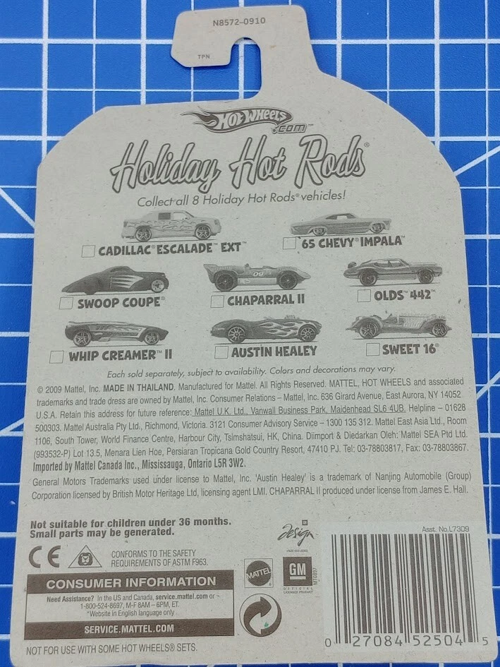 Hot Wheels Holiday Hot Rods Whip Creamer II 2009 Blue & Gold Collectable Toy Car SKU#008610 Look closely at the pictures to see further details. PLEASE see photos for detailed condition!! PLEASE LOOK AT THE PHOTOS CAREFULLY BEFORE PURCHASING!! If you are purchasing more than one item from us and would like combined shipping, PLEASE request an adjusted invoice from us while still in the cart and BEFORE paying. eBay does not usually calculate combined shipping accurately and you might get overcharged. Please be aware that when we photograph items, we use lighting that will show the details well. Although we try to present the product as accurately as possible, the lighting may affect the overall look of the item by appearing lighter/darker or possibly a different hue than the actual item. Depending on the type of lighting you have in your home, there may be some differences between the photos and the actual item. If this is a concern of yours, please feel free to request additional photos made in natural lighting or ask for a more detailed description of the item PRIOR TO PURCHASE! PLEASE NOTE: We greatly appreciate your interest in our item for sale. We look forward to a pleasant, quick and satisfying transaction for everybody, so please note the following information before bidding. Thank you! ITEM DESCRIPTIONS: * We will try to describe items well and provide plenty of photos. Please review these carefully before bidding or purchasing. * Only the items pictured and described are what you will receive when purchased. * We will occasionally offer an item clearly marked "AS-IS". This means that we are not sure if it works because we are unable to test it for whatever reason. We will offer these at a discounted price then a similar "working" item. It is possible that these items will work fine, but it also is possible that these items are more useful for their parts. Please only bid on or purchase these items if you are well aware of this, as we will only provide refunds of actual item price (no shipping cost refunds) for these items. * If you have any questions that aren't addressed by the descriptions or photos, please feel free to ask before you bid. * There may be bends, dents or parts of the blister that have minor issues due to long term storage Or plastic that is failing apart, paint wear, marks from items own packaging. Such things will be pointed out under the description, please look closely at the pictures for further details. PLEASE LOOK AT THE PHOTOS CAREFULLY BEFORE PURCHASING!!