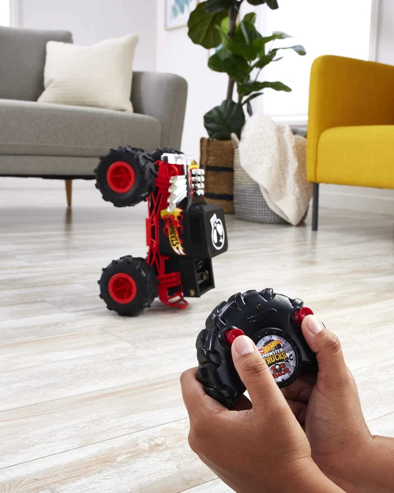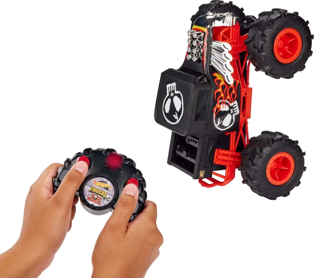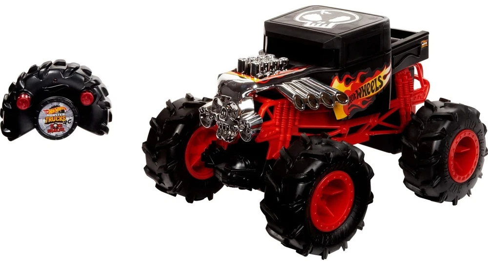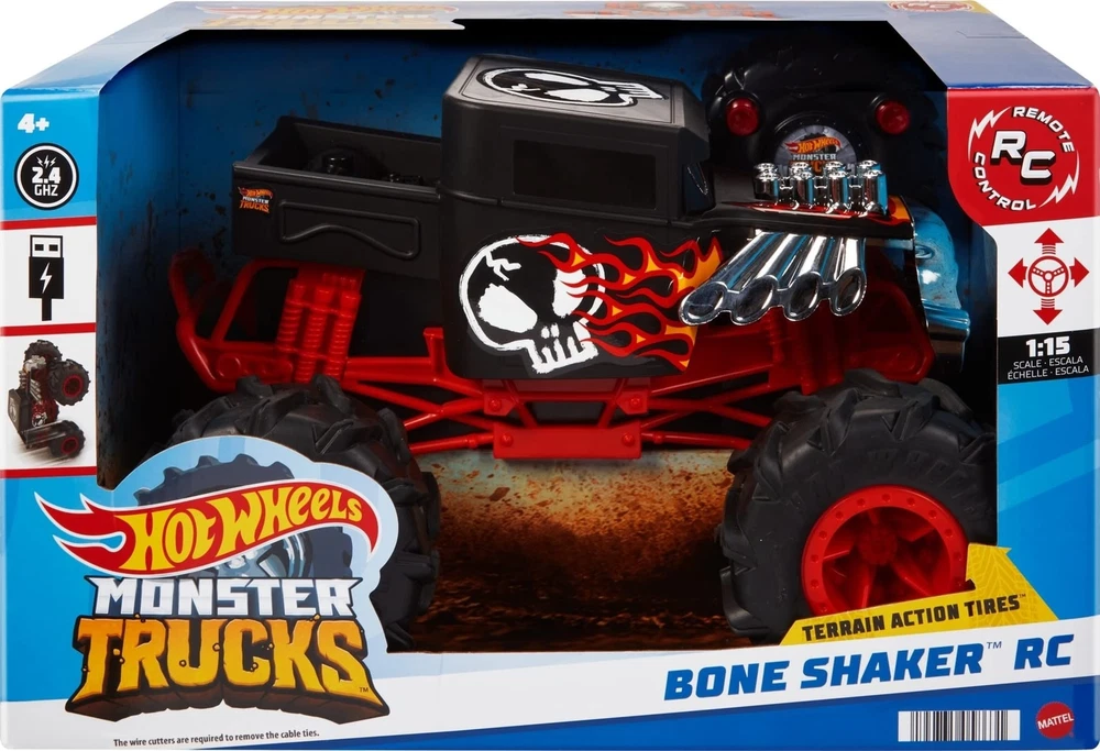 With Hot Wheels R/C Monster Trucks, kids drive monster-level excitement with full-function remote-control capabilities and Terrain Action Tires that thrash over various surfaces with ease. The 1:15 scale Bone Shaker features the exposed engine and skull-heavy decos that make it a formidable presence on the Monster Truck scene. Recharging is easy using the included USB cord, and with a 2.4 GHz frequency, kids can use it with additional R/C vehicles simultaneously without worrying about interference. Bring on the battles! Each sold separately, subject to availability. Colors and decorations may vary. The Hot Wheels RC Monster Trucks Bone Shaker delivers remote-controlled trashing and crashing in style The 1:15 scale vehicle features the fearsome decos and massive Terrain Action Tires that have made Bone Shaker a fan-favorite in the Monster Trucks universe It operates on a 2.4 GHz frequency to ensure that there's no interference when used with other remote-control devices, and the truck easily recharges with the included USB cable With the Terrain Action Tires, kids can send Bone Shaker cruising over varied landscapes – or into other Monster Trucks -and reach speeds up to 5 mph. (Additional vehicles sold separately The Hot Wheels RC Monster Trucks Bone Shaker makes a great gift for rebellious Monster Truck fans 4 years old and older