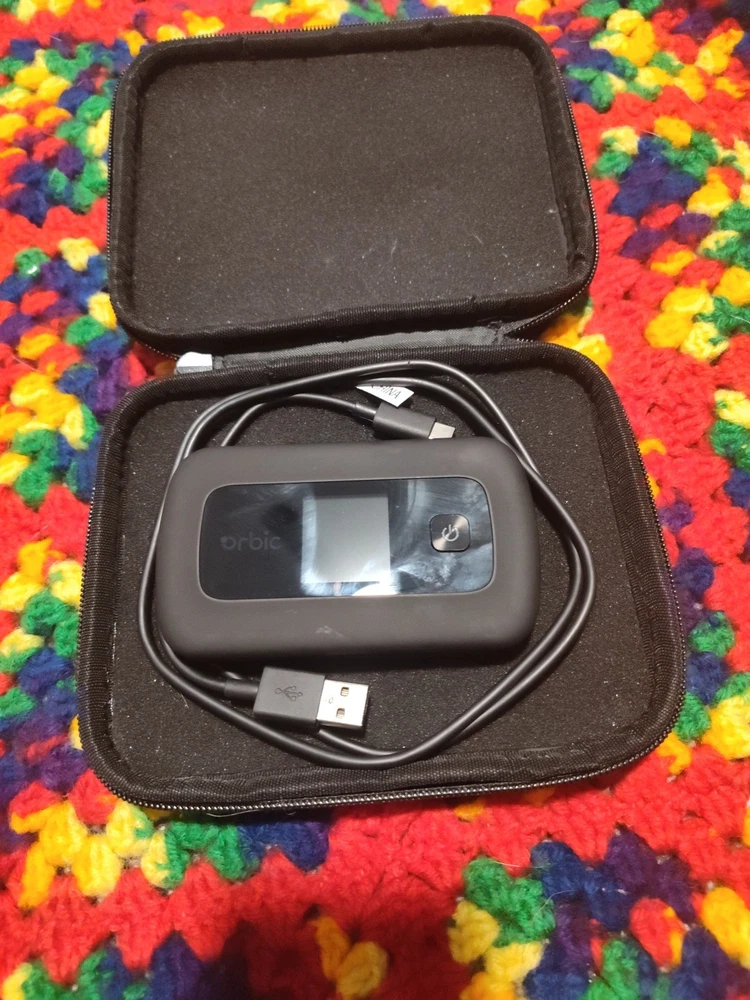 This is a Black Orbic Hotspot Modem with 4G LTE technology and USB-C port. It is unlocked and can connect wirelessly at a maximum data rate of 150 Mbps. The model is RC400L and it is designed to fit a PC. This modem has a single LAN port and is made in China. It is suitable for mobile broadband connectivity.
