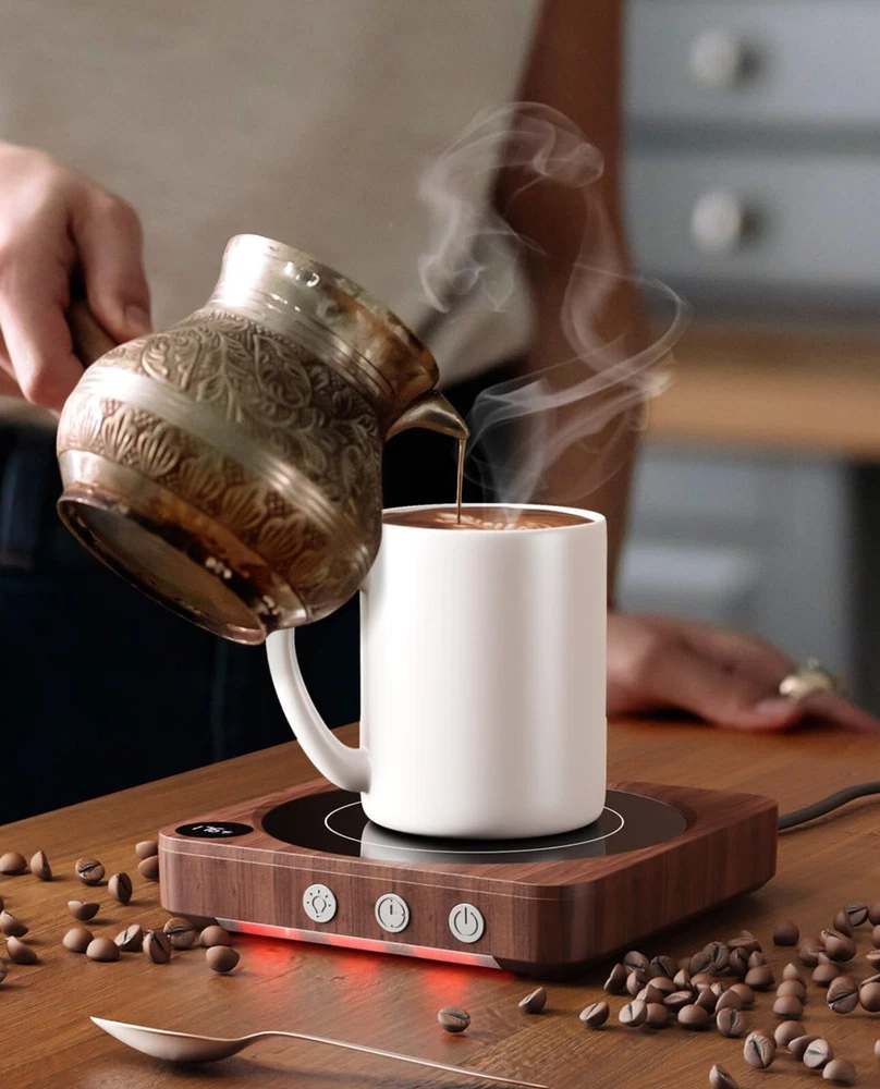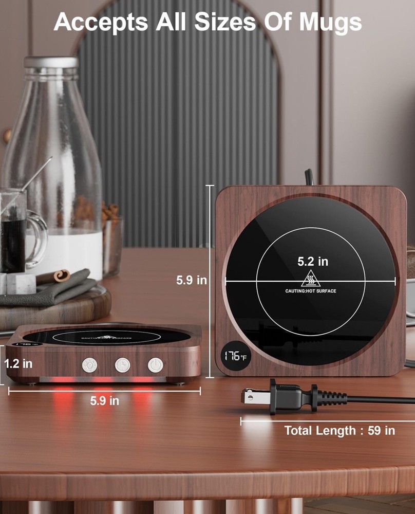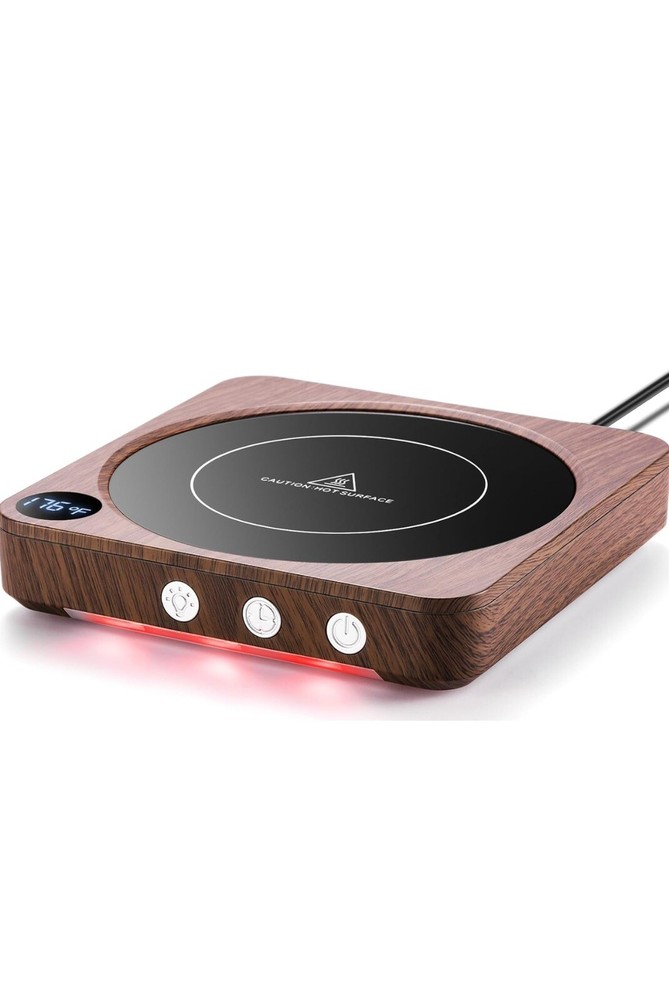 House Gem Mug Warmer is a 36W coffee mug warmer designed for desks. It has a temperature display feature and comes in a wood color. The package dimensions are 7.99x6.61x1.65 inches, and the size of the warmer is 5.86x5.86 inches. The product weighs 1.06 pounds and is suitable for keeping your favorite beverage warm while you work or relax at your desk.