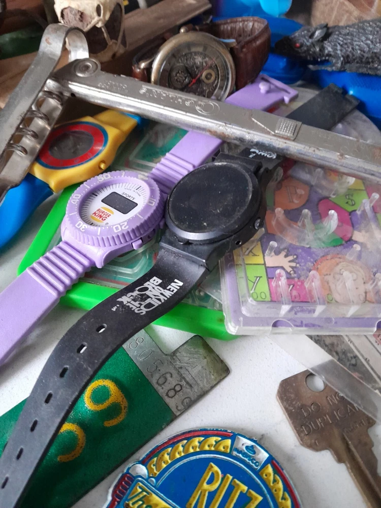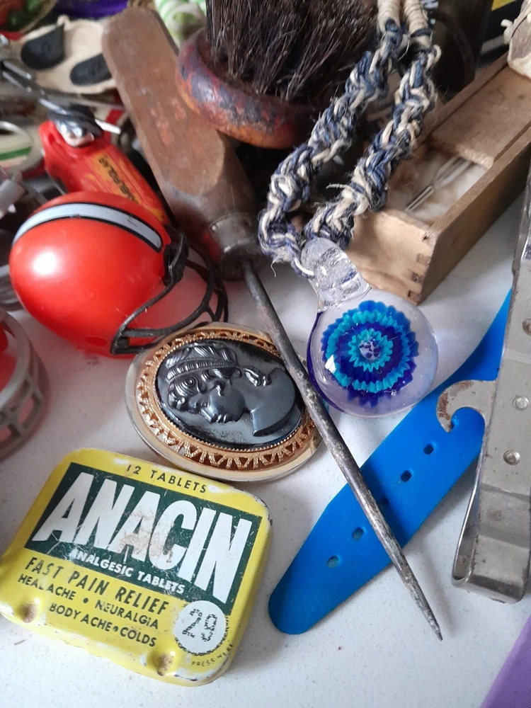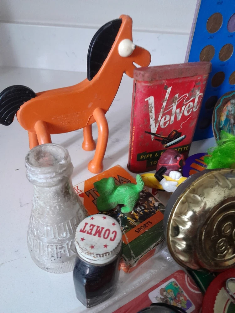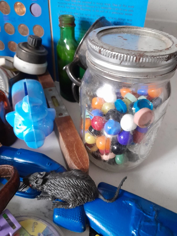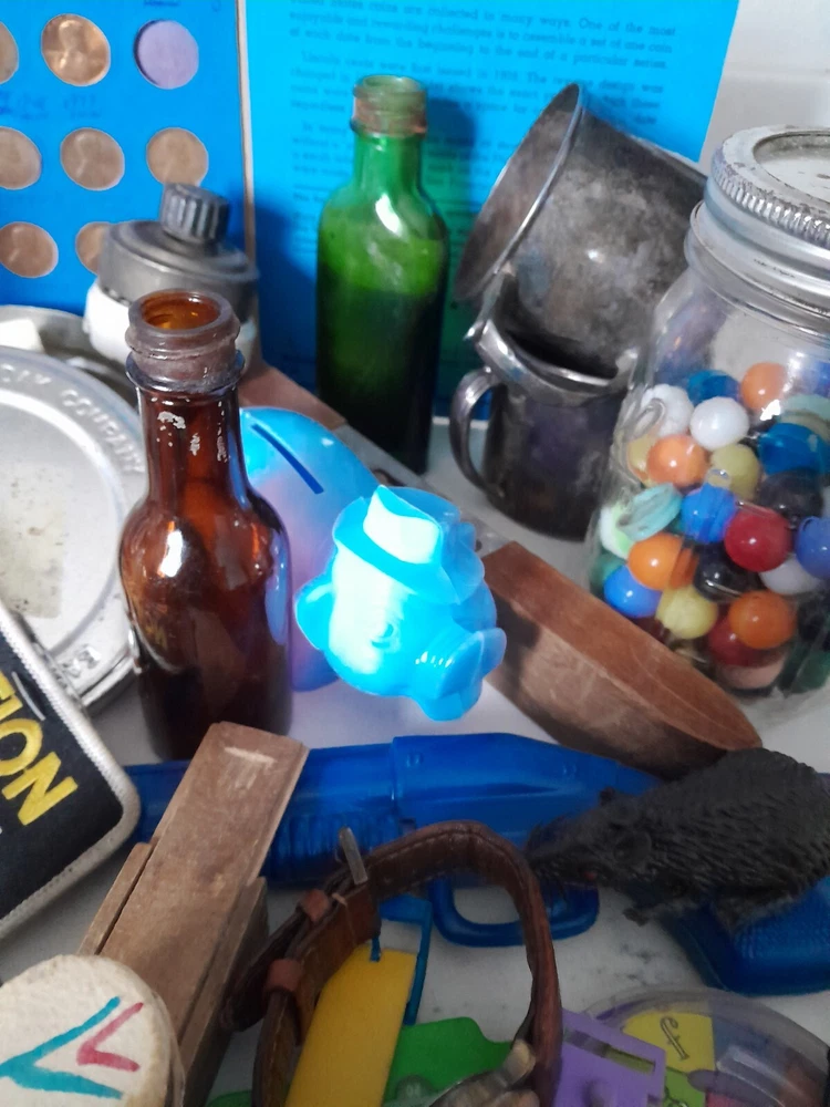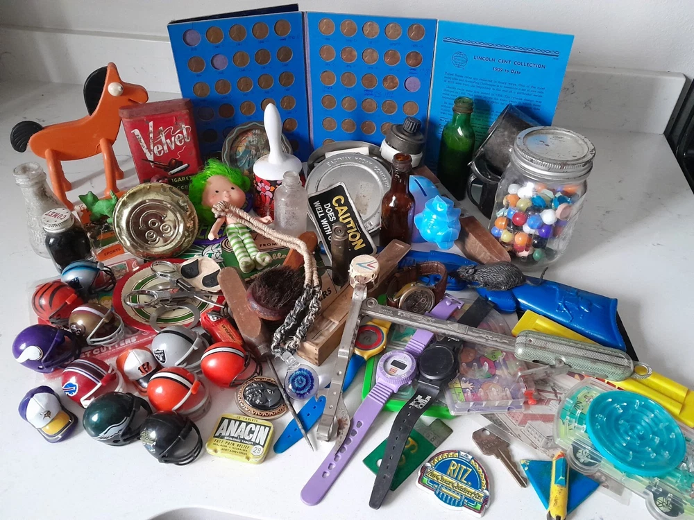 This huge vintage estate junk drawer mixed lot is a collector's dream come true. With more than 100 pieces, this lot includes a 1943 steel penny, jewelry, tins, watches, keys, marbles, toys, and more. The vintage pieces are perfect for adding to a collection or for decorating your home. The lot comes from an Estate and the type is mixed lot, with a focus on vintage pieces. Don't miss out on this unique opportunity to add a large selection of vintage items to your collection. See Pics for what's included. Too many cool items to list!!!