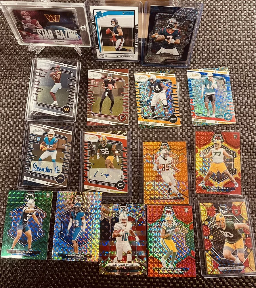 Update coming (February 22nd) Lot will be updated and available for auction soon many cards in this lot not shown yet but still included if purchased before the auction . Message me if more information and stalls needed . Great discounted bundle for any collectors inventory . And a big variety of Top rookies and veterans from all different eras and several bonus old school players, like Michael Jordan, Grant Hill, Allen Iverson and several more. 💥💥💥Priced to sell quickly for a limited time as this lot will be listed as an auction later in the week. Message me if interested and if more information or pictures are needed . An Absolute bundle with a variety of specialty cards. . Rare case hits and other nice items included. Many hidden gems in this lot See photos for item specifics and details older bonus cards may show their age so message me if more specific pictures are needed . All cards included.. 💥💥💥 More nice hits added, Autos, patches, numbered hits Rookies, and much more . Additional cards are always added as I go through my inventory but price stays the same . You’ll be pleasantly surprised with the bonus add ons . Thanks 💥💥 Jayden Daniels (Mint) Star Gazing insert and base rookie added .💥