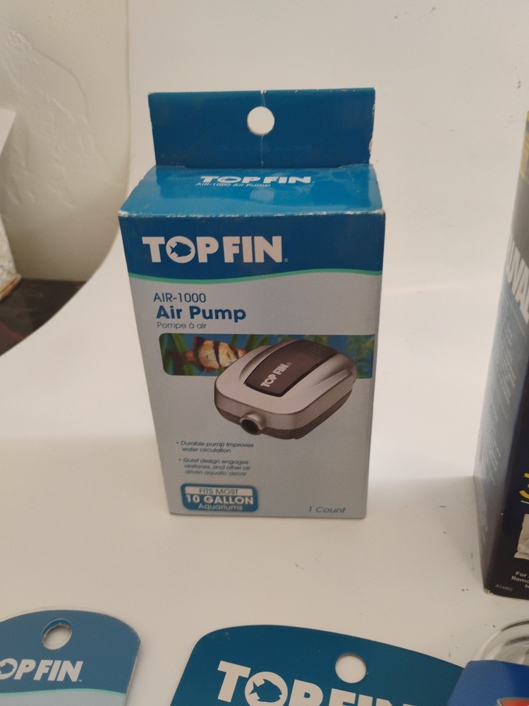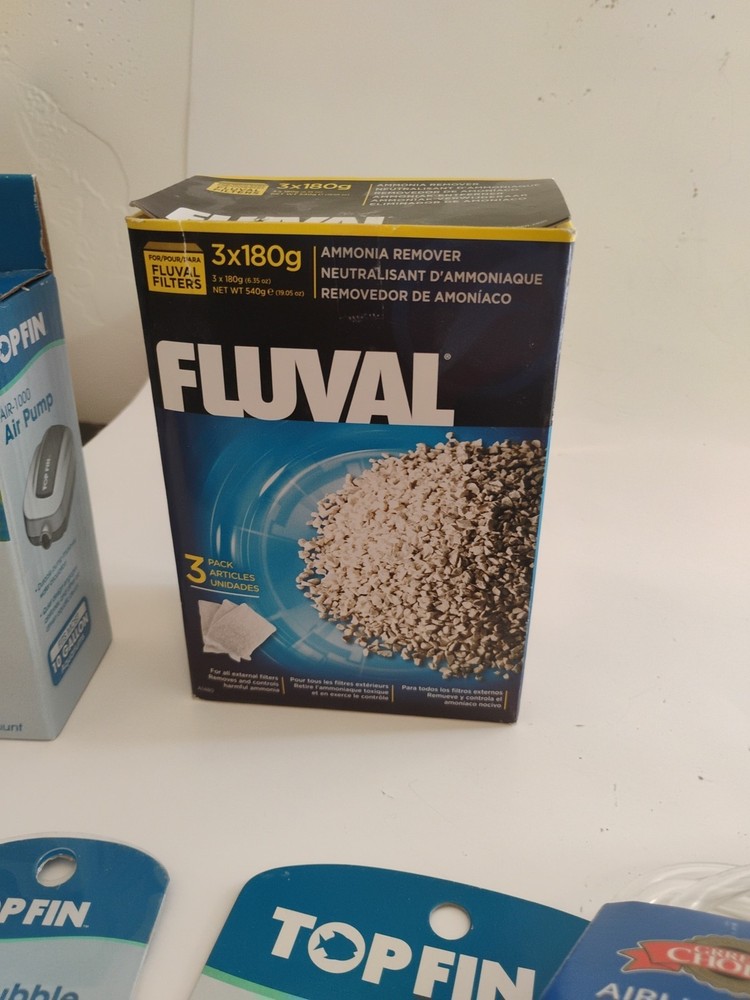 Topfin precision 3 way metal gang valve Topfin 3 way metal gang valve Grreat choice Small Air Stones (5 of 6) Grreat airline tubing 8 ft Topfin medium fine bubble air stone Aqua Clear filter insert activated carbon(2 of 3) Flu al aqua clear biomax 4.4 oz Jungle Fish Care Correct ph 8 tablets Topfin air-1000 Air Pump Fluval Ammonia Remover (3 boxes of 3, 1 box of 1)