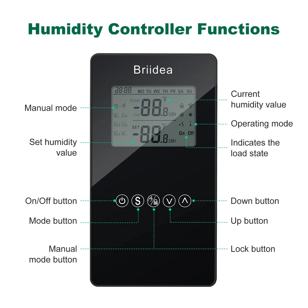 Humidity Controller, Briidea Pre-Wired Humidistat Humidifier Dehumidifier with LCD Display High Accuracy Humidity Sensor, Ideal for Greenhouse Mushroom Grow Tent Description Features: MULTIFUNCTION: The humidity controller has a series of practical functions, including dehumidification and humidification mode, manual and automatic mode, high or low humidity alarms etc. Turn on/off your equipment automatically to reach the ideal humidity level. Humanized intelligent operation design is realized HIGHLY ACCURATE DETECTION: The use of high-end and superior chip make sure the service life of the sensor is guaranteed. Accuracy can be 3%RH, to precisely provides a comfortable humidity environment you need. Support humidity calibration function EASY TO OPERATION: Large LCD screen with simple but grand appearance design looks very clean and bright, more intuitively displaying all necessary parameters. Simple 3-button for easy operation PROTECTION FEATURE: To prevent cycling and being overloaded in a short time which will damage or harm to the device and its components, it is standard configured with automatic minimum run-time setting, delay protection for control output. And also with data memory function when suddenly power off Product Details: Brand: briidea Material: Plastic Color: Black Product Dimensions: 1"L x 1"W x 1"H Manufacturer: briidea Item Weight: 1.1 pounds Product Dimensions: 1 x 1 x 1 inches Country of Origin: China Item model number: MK-041 Color: Black Material: Plastic Special Features: Humidistat Batteries Included?: No Batteries Required?: No Date First Available: May 15, 2023 Handling We will ship all orders within 3 business days of payment. Delivery We do not ship outside of the Continental US. Feedback We take our reputation seriously, we buy and sell online, so we understand the value of trust. If you are unsatisfied with your order, please contact us and we will work with you to resolve it to your satisfaction.