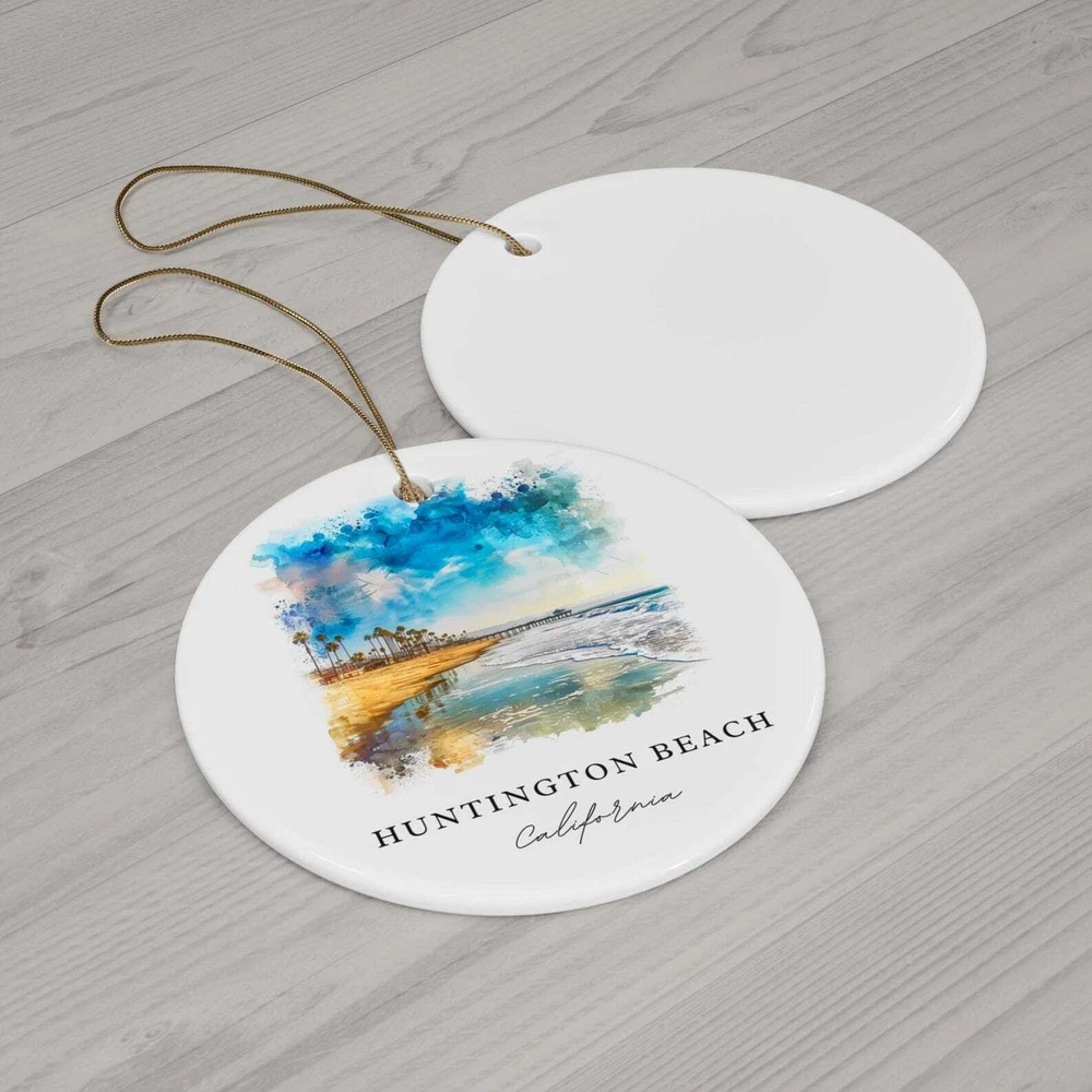 Huntington Beach Ornament Unique Huntington Beach Ca Souvenir Huntington Beach Xmas Decor And Authentic Huntington Ca Christmas Gift Material: Ceramic Color: White Shapes: Circle, star, heart and oval Can be printed on both sides Imprint full-color artwork, photos, or logos Hole for hanging string and hanging string included Printed in the USA