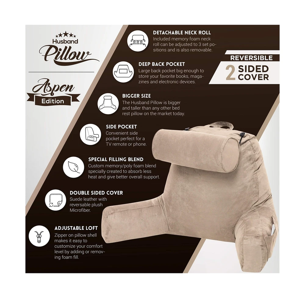 Husband Pillow XXL Aspen Edition, Adult Reading Sit Up Bed Rest Pillow for Bed with Arms & Neck Roll on Bungee Cord - Premium Memory Foam - Reversible 2 Sided Cover Micro Suede or Plush, Cowboy Taupe Description Features: Microplush/Microsuede Bronco-bustin bedrest pillow: the cowboy aspen special edition husband pillow is bigger and better than the rest of the cowpokes! Far more than just an ordinary pillow, this backrest pillow with arms serves as a sturdy and full-formed bed backrest that supports the entire upper body as no other pillow can. And its easy to saddle up and take along with you anywhere you go, with its handy built-in handle at the top. Back restin in the saddle: youll feel mighty comfortable with this supreme support pillow that is filled with premium shredded memory foam and features unique reversible two-sided combination smooth microsuede / microfiber covers with double-headed holster zipper. The aspen special edition husband pillow creates the perfect back support in bed for sleeping, resting, lounging, reading and bedrest. Like a true buckaroo, this pillow is rugged and durable, yet soft and genteel. Theres gold in them thar hills: smile...Knowing your gold goes further, when you buy this unique pillow that includes a detachable neck roll on a bungee cord that can extend the pillow height, support your neck comfortably, or come off completely and be used as a lumbar support. Theres also a built-in side saddle to hold your remote, phone, etc. As well as a back pocket to hold your glasses, a book or magazine, the neck roll or removable covers, or anything else you want close at hand. Your hoss is versatile and portable: riding the range can really take it out on a cowboy...So customize your comfort in that saddle! The cowboy aspen husband pillow boasts adjustable loft. With the handy zipper on the inner shell you can add or remove foam for individualized comfort, or shift the foam around in certain areas to achieve support just where you want it. We can even provide extra foam if more Stuffing is needed. After all...A cowboy is only as good as the horse he rides! Comfort Guarantee: The superior quality and workmanship of the husband pillow is backed by our promised to resolve all issues . This pillow is taller and wider than the leading backrest pillows available, measuring a generous 31 inches in height. In addition, we sell extra covers, should you ever want to change colors or replace the cover. Product Details: Brand: Husband Pillow Special Feature: Removable Cover Color: | Cowboy Taupe | Size: Aspen Edition Fill Material: Memory Foam Brand: Husband Pillow Special Feature: Removable Cover Color: | Cowboy Taupe | Size: Aspen Edition Fill Material: Memory Foam Shape: Wedge Age Range (Description): Adult Recommended Uses For Product: Reading Use for: Back Material: Memory Foam Item Firmness Description: Soft Product Care Instructions: Machine Wash Number of Pieces: 1 Pattern: Solid Item Weight: 9.9 Pounds Variety: Memory Foam Fabric Type: Microplush/Microsuede Model Name: Husband Bed Rest Pillow UPC: 786032511225 Manufacturer: Hit Notion Product Dimensions: 15.35"L x 12.2"W Unit Count: 1 Count Global Trade Identification Number: 25 Item Weight: 9.9 pounds Country of Origin: China Item model number: HUSB-COW-CTaupe Refill: Memory Foam Batteries required: No Shipping Most orders will be shipped within 1 business days once we receive your payment. Except on weekend or public holidays. A shipping notification will be emailed to you once your order has been shipped. International shipping via eBay Global Shipping Program. No shipping to AK, HI, PR, APO/FPO, US Protectorates and PO Box. Payment We Accept Payment Via PayPal and All Major Credit Cards. Return We stand behind our products. Items can be returned for exchange or full refund within 30 days from the date you receive your merchandise. Return shipping is the responsibility of buyer unless the return is a result of our mistake (i.e., your receive the wrong item). We will pay for shipping replacement back to you if an exchange of the same product is requested. Contact us If you have any questions please contact us. We respond within 1 business day or less.