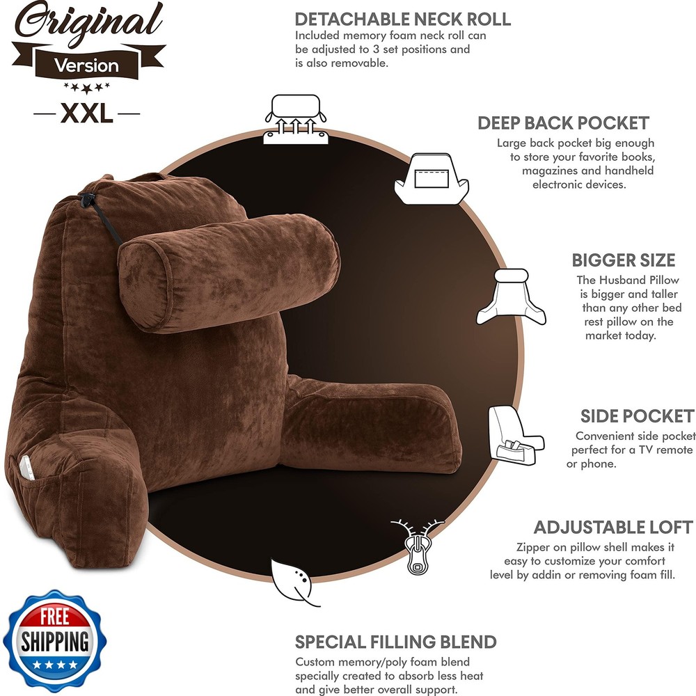 Husband Pillow XXL - Reading Pillow Bed Chair with Arms and Back Support - Chocolate - Back Pillow for Bed Sitting Up - Bed Rest Arm Pillow - Comfy Reading Pillow for Adults Features Full Back & Arm Support: Bed chair pillow and sit-up pillow for bed that doubles as a reading pillow and backrest for adults, providing firm, comfortable support for reading, lounging, or working. Perfect for All Ages: Ideal for adults and kids alike, this cozy reading pillow is great for bedrooms, dorms, and living rooms - perfect for the whole family. Versatile Use: Functions as a book reading pillow, sit-up pillow, or backrest pillow-perfect for beds, couches, dorm rooms, and more. Oversized & Ergonomic: Extra-large design with arms offers full upper body support for reading, gaming, or working comfortably for long periods. Premium Quality & Easy Care: Features shredded memory foam core, washable microplush cover, neck support, and handy pockets for added convenience and durability. Shipping Free & Fast Shipping: We offer free shipping to most of the USA with a normal delivery time of 3-7 days. However, due to the current situation, additional delivery time (up to 3 weeks) may be required for some items. Alternative Carriers: We may use alternative carriers (e.g., USPS, FedEx, UPS) to ensure your package arrives safely and on time. Due to the use of multiple carriers, we are unable to provide a tracking number automatically. Handling Time: Orders are processed and shipped within 1-2 business days of receiving cleared payment. Shipping Restrictions: Shipping to Alaska, Hawaii, Puerto Rico, Guam, and other US territories may incur shipping charges or delivery restrictions. Please contact us before ordering, or your order can be refunded/cancelled. State Restrictions: Certain items may not be shipped to California due to state regulations. Contact for Tracking Updates: If you require tracking updates or have any concerns about the delivery of your order, please feel free to contact us, and we will be happy to assist you. Return Policy 30-Day Hassle-Free Returns: If you are not completely satisfied with your purchase, you can return the item for free within 30 days of receiving it for a full refund or exchange. Easy Return Process: Contact us, and we will provide you with a prepaid return shipping label and detailed instructions. No Restocking Fee: There are no restocking fees for returns. However, the buyer is responsible for return shipping costs if the return is not due to a seller"s error. Refund Processing: Refunds will be processed within 1 business day of receiving the returned item in its original condition. Feedback Your feedback is extremely important to us. We strive to provide the best products and customer service possible. If you are satisfied with your purchase, please take a moment to leave us a positive review. If you have any concerns or issues with your order, please contact us before leaving negative feedback. We are committed to resolving any problems and ensuring your satisfaction. Contact Us If you have any questions or concerns, please feel free to reach out to our customer support team. You can contact us through the eBay messaging system. We are available Monday to Friday, 9:00 am to 5:00 pm EST, and we will do our best to respond to your inquiry within 24 hours. Thank you for supporting our small family business!