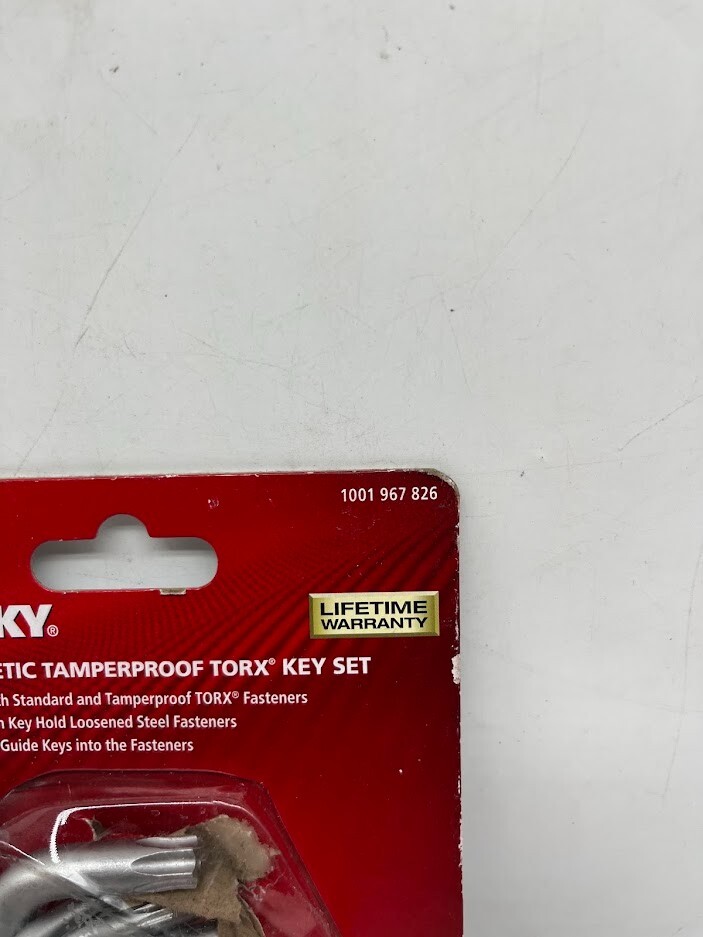 The item is new, unused. Listed as open box due to the fact there is some packaging distress. The Husky 9-Piece TORX L-Key Set is a versatile and durable solution for handling a wide range of TORX and tamperproof TORX fasteners . Designed for precision and strength , this set includes nine commonly used sizes and features a magnetic long arm for standard TORX fasteners and a short arm for tamperproof TORX applications . Key Features: Includes 9 TORX Sizes: T10, T15, T20, T25, T27, T30, T40, T45, and T50. Dual-Function Arms: Magnetic long arm for standard TORX fasteners; short arm for tamperproof TORX. Chamfered Ends: Helps guide the key smoothly into the fastener. Laser-Etched Size Markings: Easily identify the correct key for the job. Plastic Storage Caddy: Keeps keys organized and easily accessible. S2 Tool Steel Construction: Provides exceptional durability and strength . Satin Chrome Finish: Resists corrosion for long-lasting performance. Rotational Distortion Resistance: Maintains shape and prevents bending under pressure. Meets or Exceeds ANSI Standards for professional reliability. Perfect for automotive, machinery, and household applications , the Husky 9-Piece TORX L-Key Set ensures efficiency, durability, and easy access to essential TORX fastener sizes. We take great care to inspect all items and ensure they are accurately described. Should you have any issues with your purchase, please let us know immediately. We are committed to resolving any concerns promptly and to your satisfaction. Our small business truly appreciates your patronage.