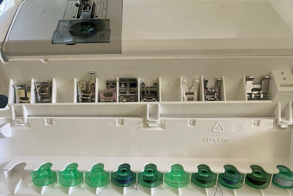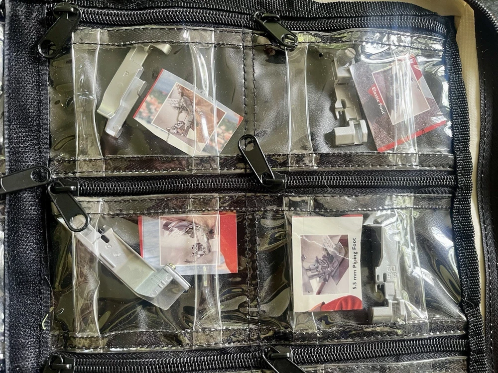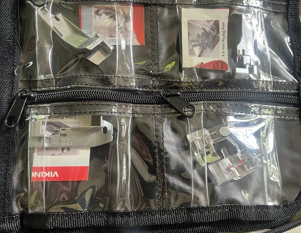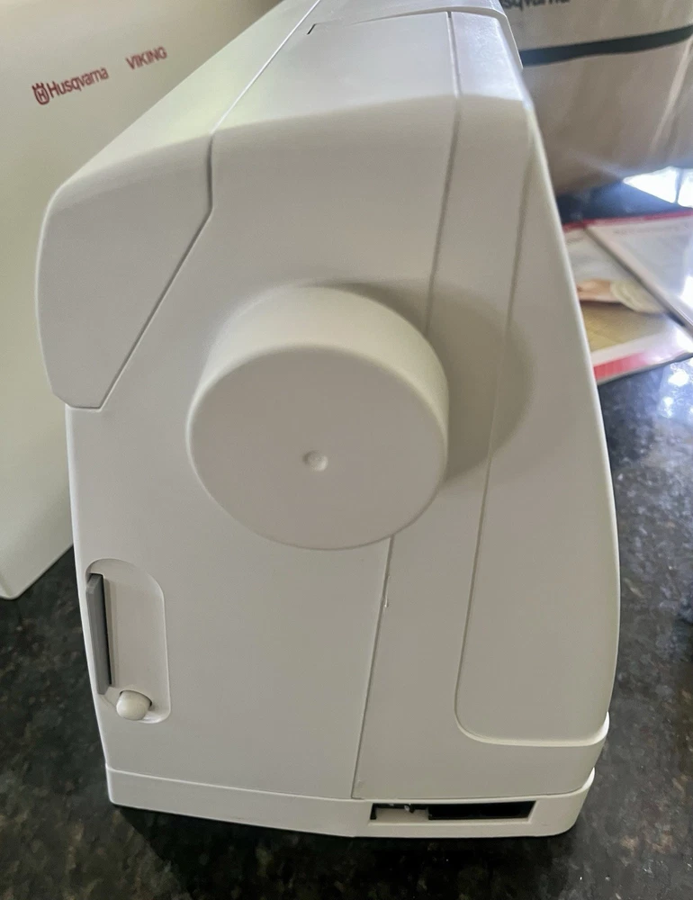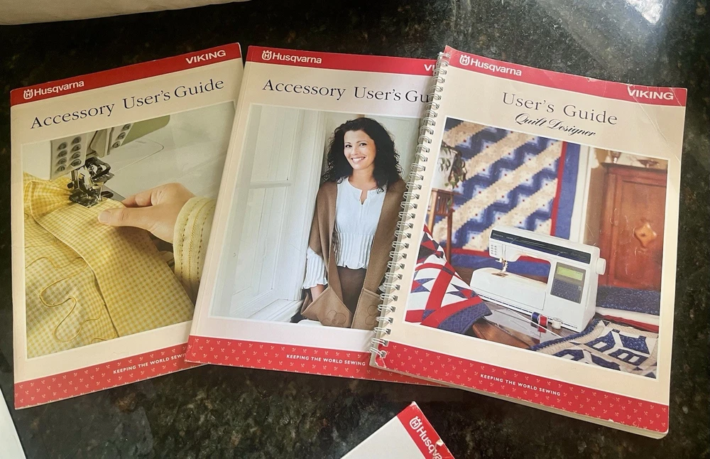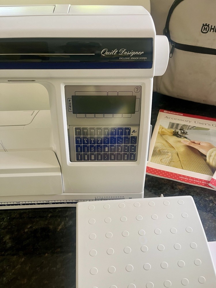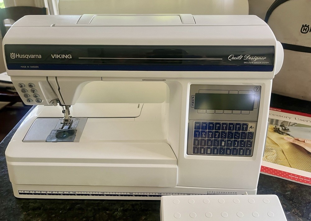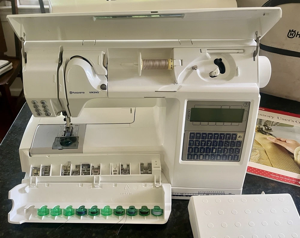 Husqvarna Quilter sewing machine with carrying case, carrying binder with 18 specialty feet plus original manuals, foot pedal, chords, digital controls, tools and thread. See pictures! Perfect condition! Amazing machine with quilting computer and digital cards for patterns and stitchery. Barely used! Amazing complete sewing set up!