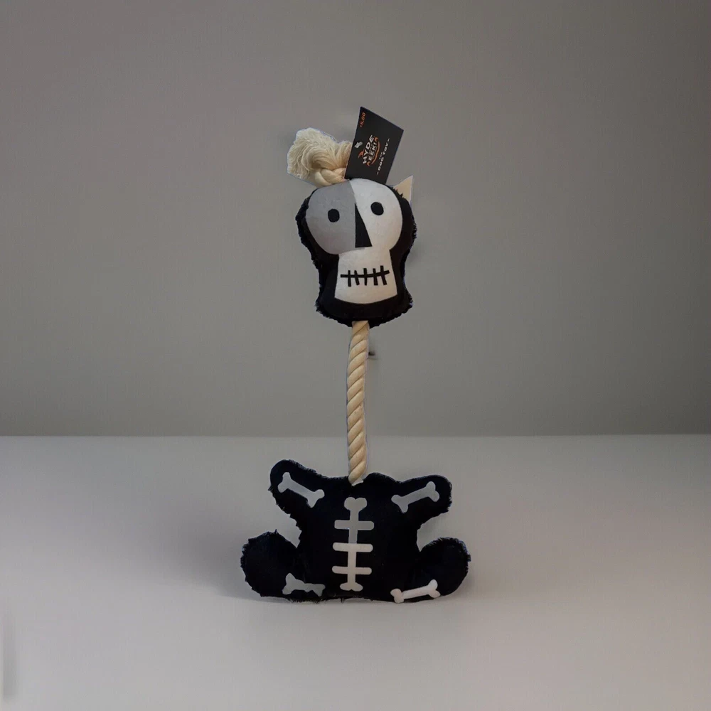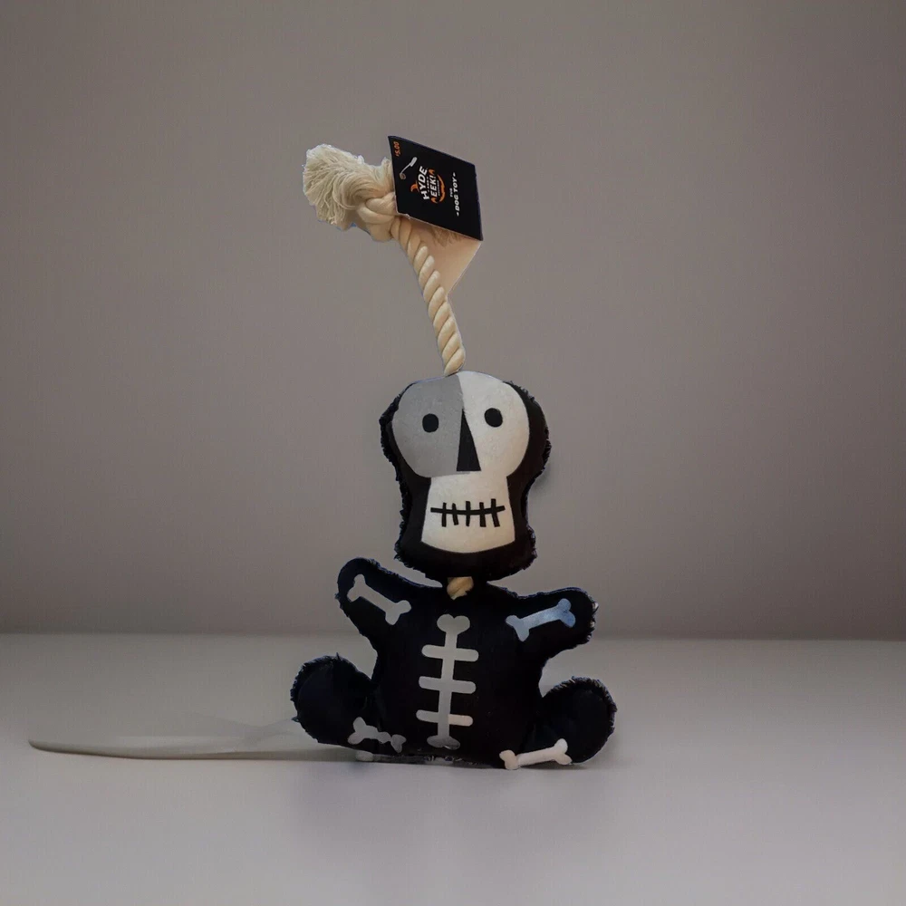 Hyde & Eek! Halloween Rope Skeleton Slide Dog Toy Tug Dog Toy That Squeaks Hyde & EEK! Boutique Rope Skeleton This rope dog toy features a sliding skeleton with squeaks for more excitement and fun. Made with soft and lightweight fabric, this plush toy for dogs helps keep them engaged in fetch and tug play. Dimensions (Overall): 15 Inches (L), 6 Inches (W) Weight: .17 Pounds Intended Pet Type: Dog Features: Squeaks Pet Toy Type: Rope, Plush Pet Activity: Fetch, Tug Material: Polyester Care & Cleaning: Spot or Wipe Clean