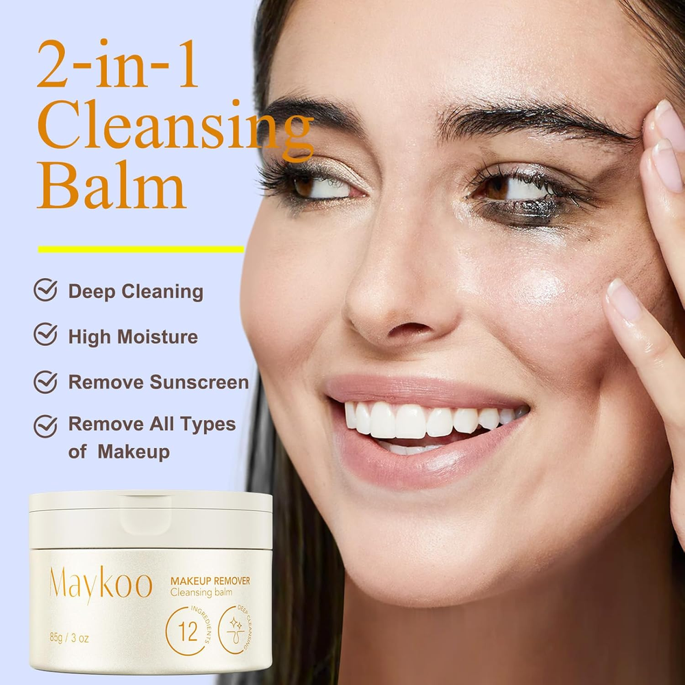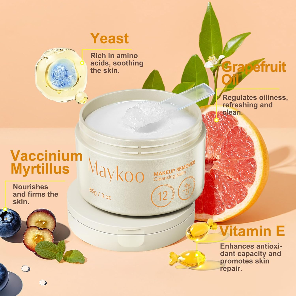 Cleansing and Hydrating 2-in-1 Cleansing Balm: MAYKOO makeup remover contains Vaccinium Myrtillus , as well as a variety of minerals and antioxidants, deeply cleansing the skin while giving it deep nourishment, bringing gentle care to the skin Quick Emulsification Technology:Melting balm makeup remover contains highly efficient oil solvent, instantly dissolves makeup, deep into pores to clean dirt, oil, residue and blackheads.Leaves skin fresh and clean, free from residual burden. Makeup eraser Oil Based Makeup Remover: Seleted ingredients *12, plant extract oil*2, simplify ingredients, reduce skin burden & focus on efficacy.Yeast - rich in amino acids, soothing skin; Grapefruit oil adjusts oil, refreshing and clean. Eco-friendly & Comfortable Mild and Non-irritating: No alcohol, no flavors, no artificial colors. Thorough oil based cleanser for face: Easily remove eyes, lips, face and sunscreen residue. Vegan and cruelty-free.This cleansing balm is suitable for all skin types Built-in Spatula for Hygiene & Ease: Scoop remover balm with spatula, gently massage into dry skin in circles,melts into oil on contact with the skin to break down makeup. Emulsify with water, massage,then rinse/wipe. Quick & effective makeup removal oil Product Description 1 Built-in Spatula 2 Moisture & Cleansing 3 Safe & Gentle
