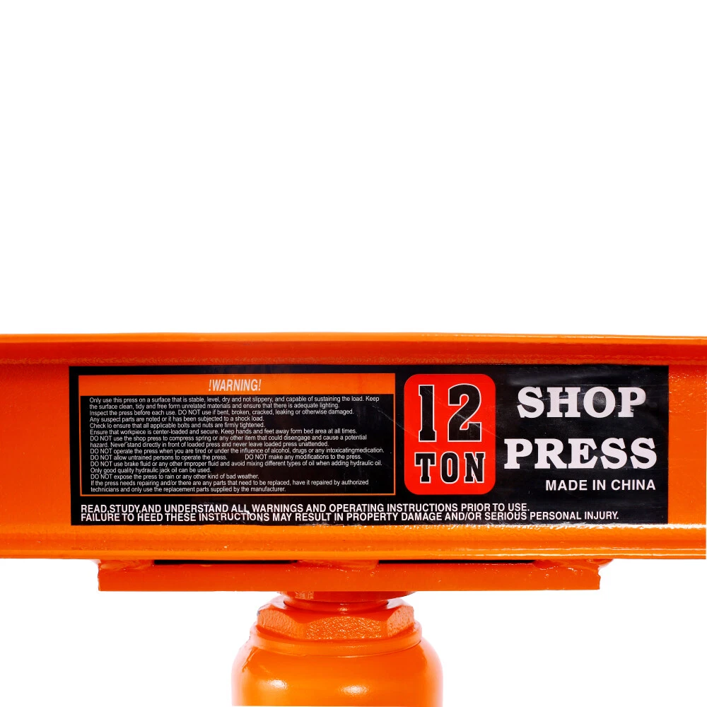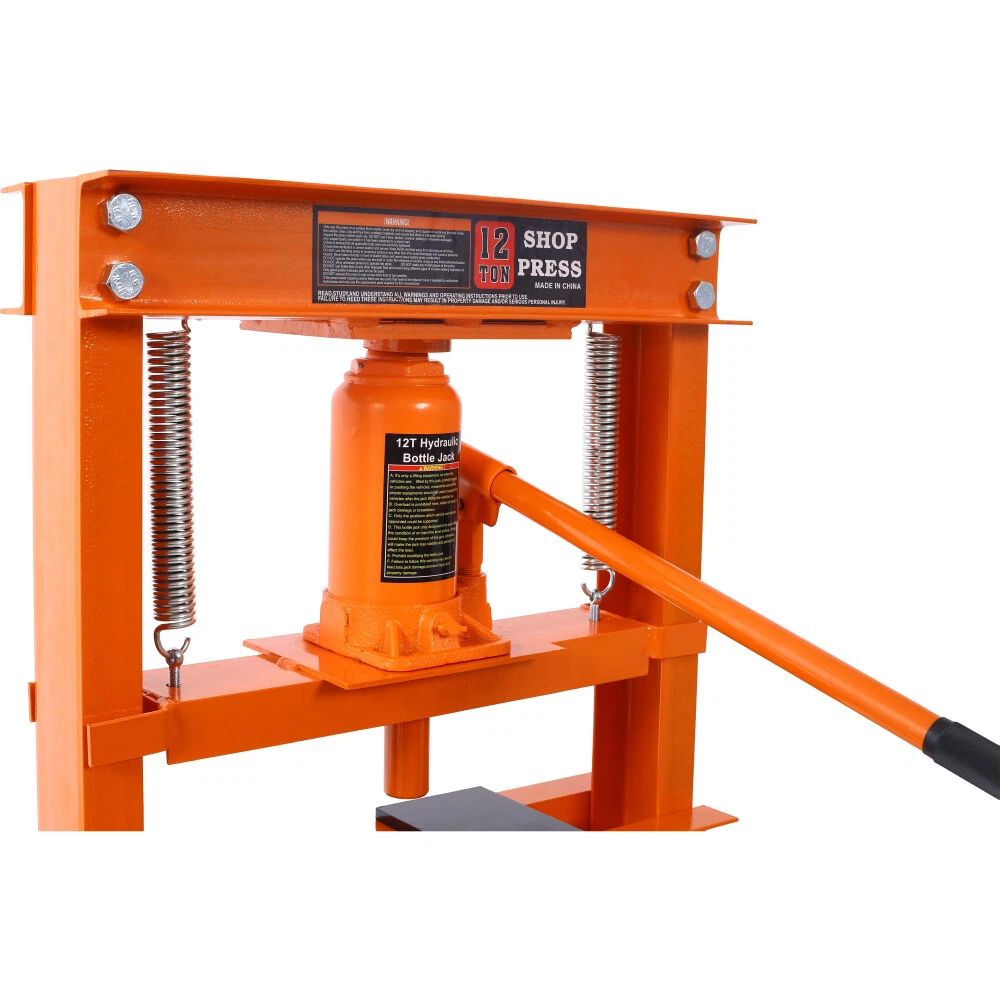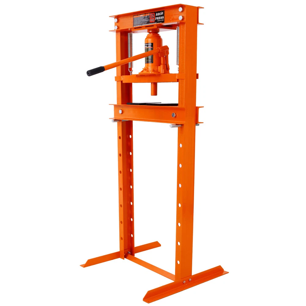 Hydraulic Shop Press ,12-Ton Capacity , Floor Mount ,with Press Plates, H-Frame Features Versatile working table: Our hydraulic shop press features an adjustable working table with 8 holes on each side, allowing you to easily customize the height according to your specific needs and projects. Powerful 12-ton capacity: Equipped with a heavy-duty bottle jack with a 12-ton capacity, our hydraulic press is designed to effortlessly handle tasks like straightening and bending metal. It also comes with press plates for added convenience. User-friendly operation: Operating our hydraulic shop press is a breeze. Simply press or lift the long handle of the bottle jack to easily apply the necessary force. Please ensure all parts are fully secured before use. The pressure of the hydraulic jack can also be easily adjusted by turning the knob. Durable construction: Crafted from high-quality steel with a power coating, our hydraulic shop press boasts excellent durability and longevity. The inclusion of thickened springs ensures a robust pulling force and fast oil return. Wide range of applications: Our hydraulic shop press is perfect for various metalworking tasks, including bending, straightening, and stamping. It is an indispensable tool for auto repair shops, garages, and other small repair businesses. Product Information Item :Shop Press Product Type: General Item Product Name: Hydraulic Shop Press ,12-Ton Capacity , Floor Mount ,with Press Plates, H-Frame Garage Floor Press, Adjustable Working Table Height,orange Main Color: Orange Main Material: Steel Product Dimensions Assembled Length (in.): 23.00 Assembled Width (in.): 22.00 Assembled Height (in.): 52.40 Weight (lbs.): 86.00