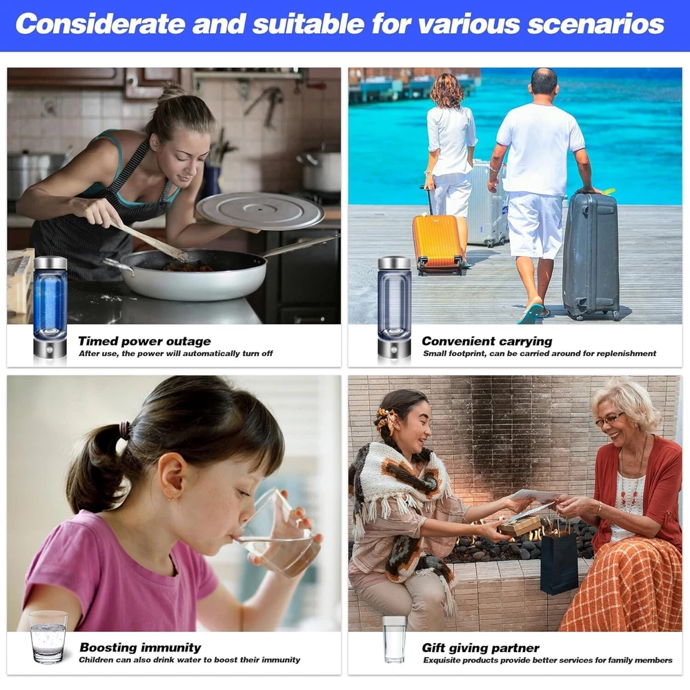 About this item Improve Water Quality in 3 Minutes : Using advanced SPE and PEM technology, 3 minutes of rapid electrolysis improves water quality. A single use can produce a high concentration of 1600 ppb hydrogen, turning ordinary drinking water into alkaline water rich in hydrogen ions. Suitable for all drinking water quality. Provide you with high quality water source. Food Grade Material : Made of food-grade borosilicate glass, it is sturdy and durable and does not contain any harmful substances. The lid of portable hydrogen water generator has a closed design and a thick sealing ring, which provides strong sealing and maintains the concentration of hydrogen. Don't let leaks become your worry. (❗❗ Please note that the hydrogen water cup should be placed upright when using it. If it is placed sideways or upside down, the water cup will leak due to pressure.) Easy to Use and Clean : After pouring 80% of the water into the hydrogen water cup. Just press lightly, the blue light on the bottom lights up and the hydrogen gas decomposes from the water. Equipped with a unique design, both the bottom and top can be easily unscrewed for easy cleaning, hydrogen water maker provide you with the best hydrogen-rich water experience. Simple Stylish Design : The bottom of hydrogen water maker bottle is equipped with a soft EVE pad, which is stable and non-slip. USB design allows you to make hydrogen-rich water anytime and anywhere, suitable for office, exercise, travel and other occasions. Large capacity of 420ml meets your health needs. Healthy Gift Options : Long-term drinking of hydrogen-rich water can promote metabolism, relieve muscle soreness, improve sleep, and provide health protection for your relatives and friends. We provide exquisite gift box packaging and high-quality after-sales service.This hydrogen water machine is a perfect gift choice! Product Description Hydrogen Water Bottle Wide Range of Usage Scenarios Food Grade Material