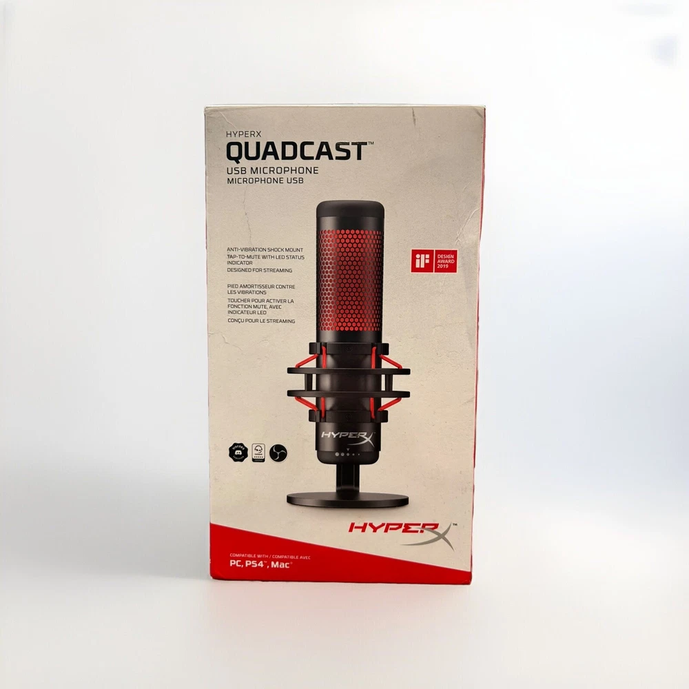 CONTENTS: Gaming Microphone, Original USB Cable, Mount Adapter Feel free to contact me with any questions. Thanks for taking a look! Full-featured standalone mic for streamers, content creators, and gamers. The HyperX QuadCast™ is the ideal all-inclusive standalone microphone for the aspiring streamer or podcaster looking for a condenser mic with quality sound. QuadCast comes with its own anti-vibration shock mount to help reduce the rumbles of daily life and a built-in pop filter to muffle pesky percussive sounds. Instantly know your mic status with the LED indicator, and simply tap-to-mute to avoid awkward broadcasting accidents. Select between the four polar patterns (stereo, omnidirectional, cardioid, bidirectional) and use the conveniently-located gain control dial to quickly adjust your mic input sensitivity. The included mount adapter that fits both 3/8” and 5/8” thread sizes and is compatible with most stands. Monitor your mic input with the built-in headphone jack, and QuadCast is certified by Discord and TeamSpeak™ so you can ensure that your microphone is broadcasting loud and clear for all your followers and listeners. Whether you’re plugging into a PC, PS5™, PS4™, or Mac® you’ll be able to deliver quality sound to anyone tuning in.