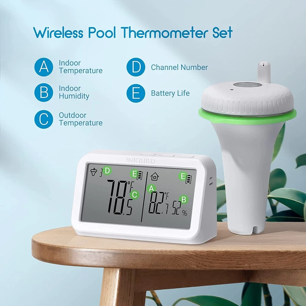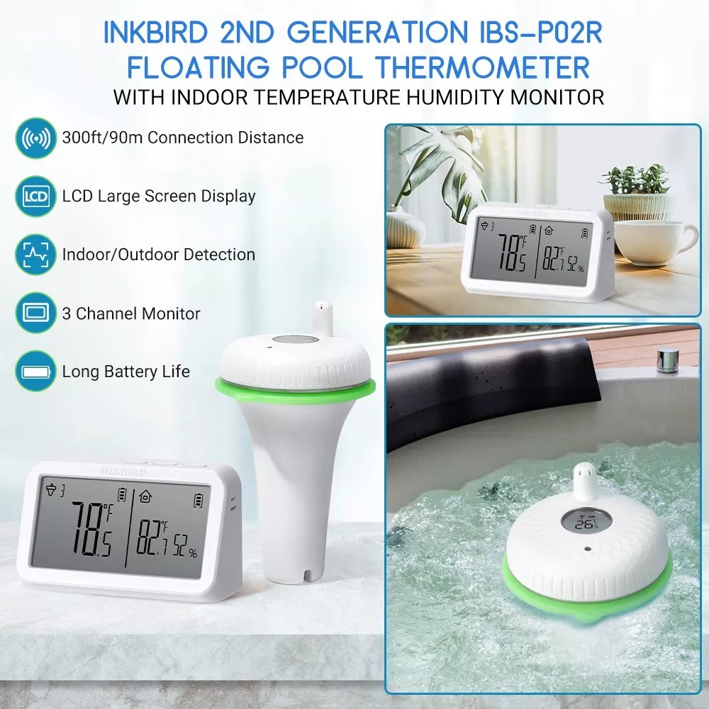 | Wireless Pool Thermometer IBS-P02R Pool Thermometer with Indoor Temperature Humidity Monitor, IPX7 Waterproof, LCD Large Screen Display, INKBIRD APP, Data Record. Remote pool thermometer wireless for Swimming Pools, Hot Tubs, Small Ponds/lakes, and Aquariums. Measurement range:14℉~140℉ ( -10℃~60℃); Measurement accuracy: ±1.8℉ (±1.0℃); Display accuracy: 0.1℉ (0.1℃) Humidity [Receiver]: Measurement range: 0~ 99%; Measurement accuracy: ± 5%; Display accuracy: 1% -Battery: 2* AAA 1.5V (not included) Wireless Distance:Up to 300 Feet High-Level Water Resistance: This pool thermometer features an advanced IPX7 waterproof body with a heavy-duty silicone sealing ring, making it more waterproof, more impact-resistant, and more protected. Note that the silicone sealing ring is not removable. Upgraded Indoor Monitor: The included indoor monitor has a large screen, which displays indoor temperature and humidity and outdoor pool temperature at the same time. It also supports checking battery life, max/min value, and ℃/℉ selection. Stable Multi-Connection: This wireless thermometer set supports long-distance connections up to 300 feet, which is stable and reliable. The indoor monitor can be connected to 3 pool thermometers,allowing us to view temperatures in different locations at the same time. High Precision Sensor: It’s trustworthy because of its high precision sensor, accurate to ±1℃ (±1.8℉). Updating data every 10 seconds helps us timely know the current water temp erature in the swimming pool without leaving our house. On Apr 24, 2023 at 02:52:17 PDT, seller added the following information: