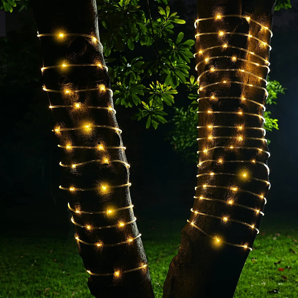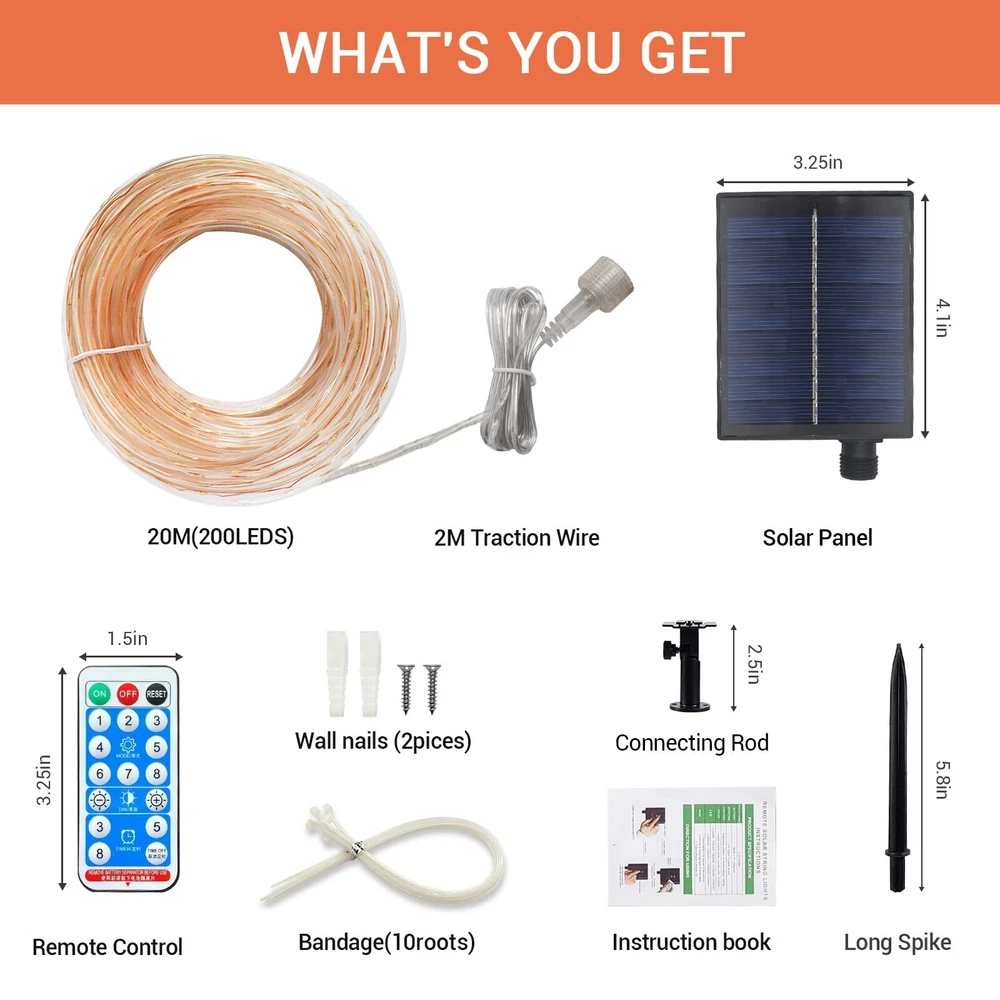 Upgrade Solar String Lights - Total 72ft / 200 led Outdoor string lights with 17 keys remote. it provide 8 light modes (1-7 are different flash modes, mode 8 is steady on), Adjust the brightness; Timer function. Total 72ft: 66ft string lights + 6.6ft traction line Energy Saving & Solar Power- High-quality solar power, effective energy saving. It built-in 1200mah rechargeable battery, absorb solar energy during the day, automatically turn on at dusk. The battery can be continuously illuminated for 8-12 hours when fully charged Memory Function & Timing Function: This solar light has memory function, you just need set one time, they stay set until you adjust them again. Timer function - 3H/5H/8H. Longer Life & More Safe - Our solar light is completely covered by a transparent PVC tube, it is durable and flexible, you could DIY the solar lights into any shape you want. It's also much safer for Kids and pets compared with ordinary copper wire string lights Christmas Decoration & IP67 Waterproof - This rope light is IP67 waterproof, you could use this it in sun/ wind /rain/snow/ fog and any weather. It's a good choice for Indoor & outdoor decorations, and fit special events like party, Xmas, Halloween, Thanksgiving, wedding, birthday, Valentine’s day, etc Package: 1* string light, 1* solar panel, 1* remote control, 1* user manual, 10* zip ties. Any questions please contact us.
