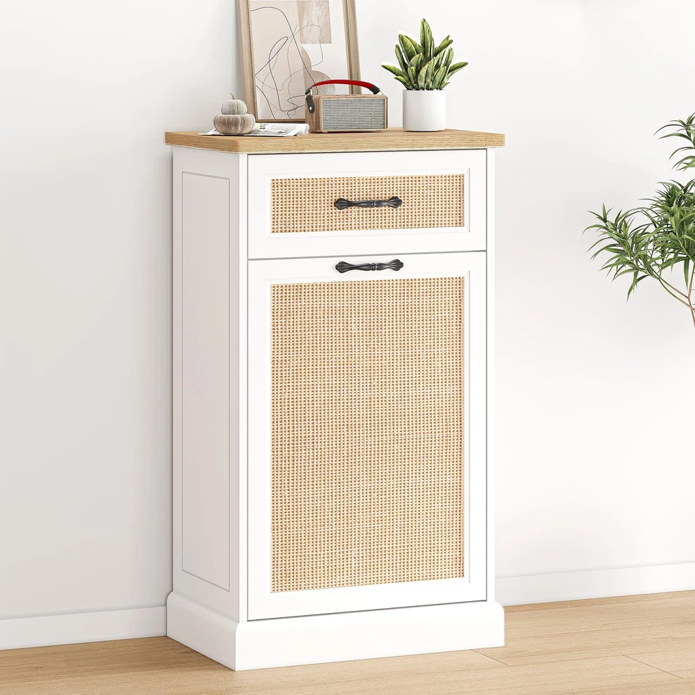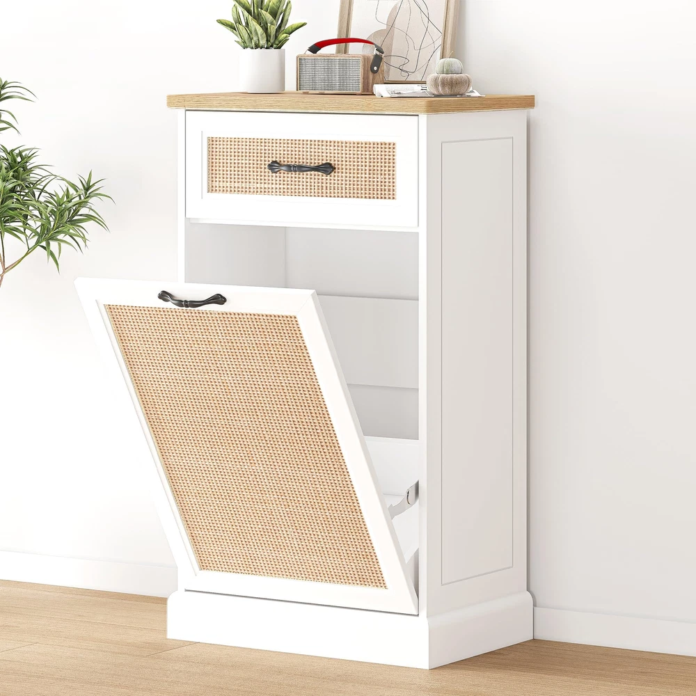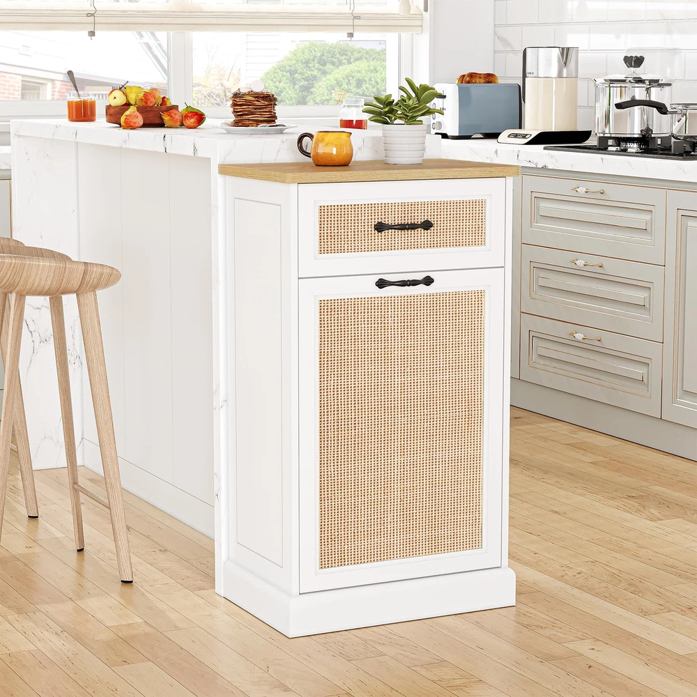 Stylish and Hidden Design:The rattan trash can cabinet is designed to cleverly hide garbage and waste, keep the kitchen or living space clean and orderly, with an aesthetic and decorative effect. And this freestanding pet-proof garbage can cabinet has no top lid, effectively preventing pets from entering the trash can and reducing the risk of accidental spills. (Pet friendly trash can) Convenient Garbage Disposal: The inclined opening design makes garbage disposal easy and simple. Just gently tilt the front panel for quick access and disposal, eliminating the hassle of moving heavy bags or buckets. Additional pull-out drawers and compartments provide additional storage space for easy sorting, recycling and storage of cleaning supplies. Sturdy and Freestanding Cabinet: The bottom and sides of our bins are reinforced to withstand up to 50 pounds of garbage for stability. It can be seamlessly integrated into a kitchen or utility room layout, providing dedicated waste storage space without taking up valuable floor or countertop space. Multifunctional Storage Solution: The 10-gallon cabinet can be used not only for trash storage, but also for pet food storage, laundry baskets, children's toys storage, and even as a kitchen island. Easy to clean, easy to take care of after each use, keep your garbage cabinet clean and tidy. Easy Assembly and Quality Service: All parts and tools for the tilt-out trash can cabinet are clearly marked in the manual, with clear assembly instructions suitable for anyone with no prior assembly experience. Whether you have questions before or after your purchase, please feel free to contact us, and we will provide you with 24/7 professional customer service.
