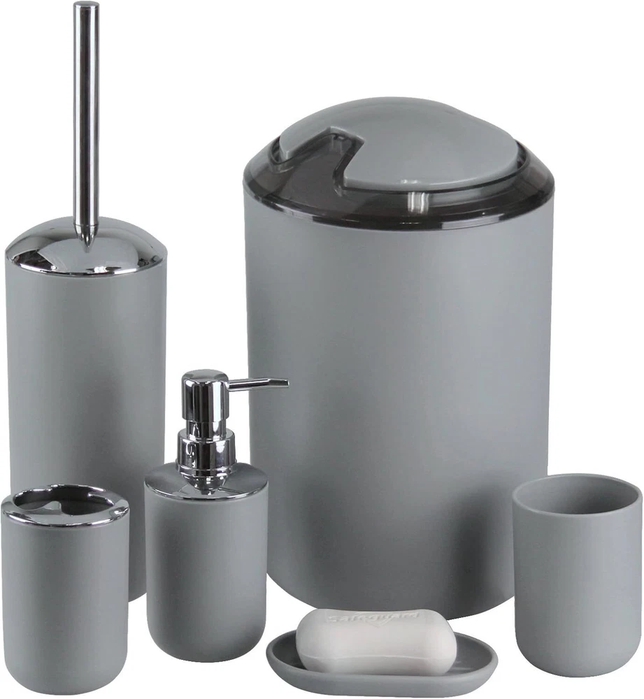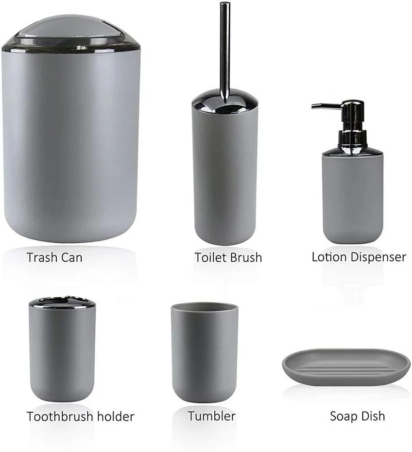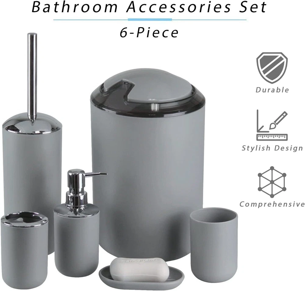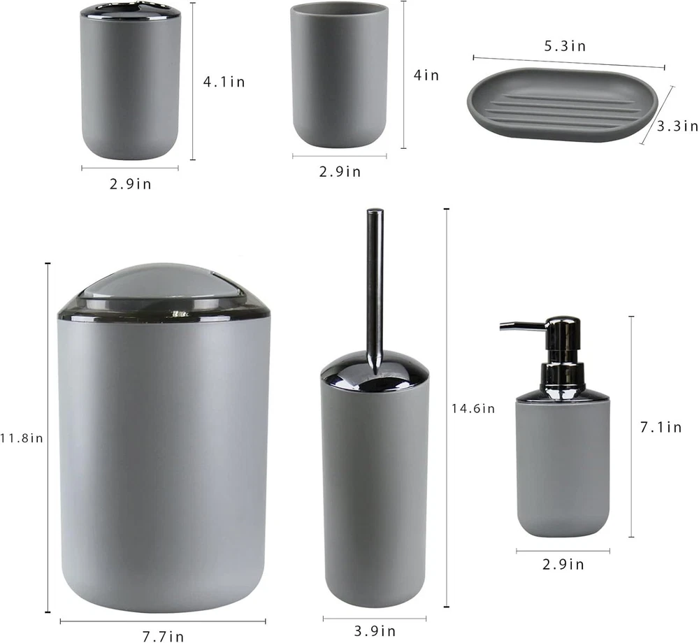 IMAVO Bathroom Accessories Set, 6-Piece Plastic Gift 6 Pcs Grey Product Details Number of Pieces: 6 Finish Type: Plastic Manufacturer: IMAVO Item Weight: 2.5 Pounds Product Dimensions: 11.8 x 7.8 x 7.8 inches Item Weight: 2.47 pounds Country of Origin: China Item model number: A-6PCS-7 Is Discontinued By Manufacturer: No Fabric Type: Plastic, Abs Finish types: Plastic Batteries required: No Material: Plastic Color: Grey Brand: IMAVO Style: Grey Included Components: 1 Toilet Brush & Holder, 1 Soap Dish, 1 Trash Can, 1 Soap Dispenser, 1 Toothbrush Holder & 1 Toothbrush Cup 1 Toilet Brush & Holder, 1 Soap Dish, 1 Trash Can, 1 Soap Dispenser, 1 Toothbrush Holder & 1 Toothbrush Cup1 Toilet Brush & Holder, 1 Soap Dish, 1 Trash Can, 1 Soap Dispenser, 1 Toothbrush Holder & 1 Toothbrush Cup See more Plastic Complete Bathroom Accessory Set:Featuring a Toothbrush Holder,Toothbrush Cup,Soap Dispenser,Soap Dish,Trash Can,Toilet Brush & Holder,our bathroom accessories set ensures a unified and stylish bathroom aesthetic. Durable Design: Our bathroom accessories set crafted from Durable and cleanable plastic, it effortlessly withstands daily wear and tear, ensuring long-lasting use. Space-Saving Design: Maximize your bathroom space with our compact and cleverly designed grey bathroom accessories set.Whether you have a small powder room or a spacious master bathroom, our bathroom accessories set offers smart storage solutions without taking up unnecessary space. Vibrant and Stylish: Add a pop of color and style to your bathroom with our vibrant and modern bathroom accessories set. they effortlessly enhance the aesthetics of your space while providing practical functionality. Versatile & Nice Gift: Our bathroom accessories set is a perfect fit for any space, whether it's your home bathroom, dorm, hotel, or RV. Its modern design effortlessly complements any bathroom, making it an ideal present for housewarmings or new homes.Whether it's for your family, friends, colleagues, or customers, this bathroom accessories set makes the nice gift.