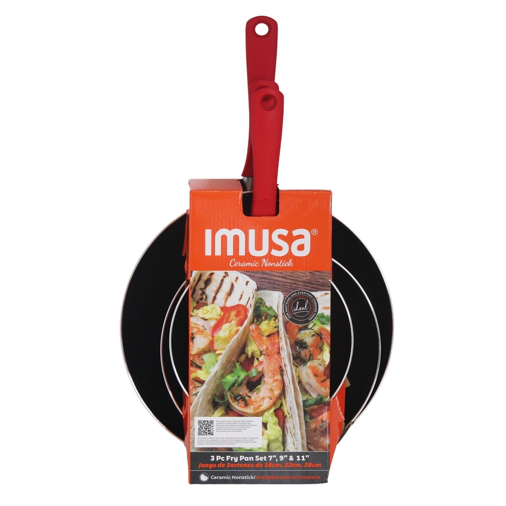 The IMUSA 3pc Aluminum Black Ceramic Fry Pan Set in Red is a versatile and practical addition to any kitchen, designed to meet a variety of cooking needs. Each pan in the set features a natural nonstick ceramic coating, promoting healthier cooking with minimal oil and ensuring effortless food release and easy cleanup. The set includes three different sizes: 7,9, and 11 inches. The IMUSA Aluminum Black Ceramic Fry Pan Set is perfect for everyday home use, making it ideal for a wide range of cooking techniques such as pan frying, stir-frying, and sautéing. These fry pans are excellent for cooking meats, fish, eggs, and more, allowing you to prepare a variety of dishes with ease. The durable aluminum construction of the IMUSA Aluminum Black Ceramic Fry Pan Set ensures even heat distribution, helping you achieve perfectly cooked meals every time. The sleek black exterior adds an elegant touch to your kitchen decor. Whether you are preparing a quick breakfast, a hearty lunch, or a delicious dinner, the IMUSA Aluminum Black Ceramic Fry Pan Set is designed to handle it all. With their natural nonstick surface and versatile sizes, these fry pans are indispensable tools for any home cook looking to enhance their culinary skills and create nutritious, flavorful meals with minimal effort. Trust the IMUSA 3pc Aluminum Black Ceramic Fry Pan Set for balanced, home-cooked meals. It will surely become your kitchen's beloved companion, uniting tradition, and innovation in every delectable creation and elevating your culinary experience. COOKING MADE EASY: The 7”, 9” and 11” fry pans in this 3-piece set offer versatility for different portion sizes, allowing you to easily prepare meals ranging from small bites to larger dishes, perfect for everyday cooking STYLISH & DURABLE: Crafted from aluminum with a black ceramic non-stick coating and a sleek red exterior, these fry pans combine modern style with long-lasting durability, providing both aesthetic appeal and practical use in your kitchen NON-STICK COATING: The ceramic non-stick coating allows for effortless food release and healthier cooking with less oil, making these fry pans perfect for preparing meals with ease, while the aluminum construction ensures quick and even heating COOKING VARIETY: Perfect for pan frying, stir frying, sautéing meat, fish, eggs, and more, these versatile fry pans allow you to create a wide range of dishes, making them an essential tool for various cooking techniques EVERYDAY KITCHEN HERO: Ideal for daily home use, these fry pans are perfect for dry heat cooking like pan frying, sautéing, and stir frying, offering both ease and reliability for all your everyday cooking tasks