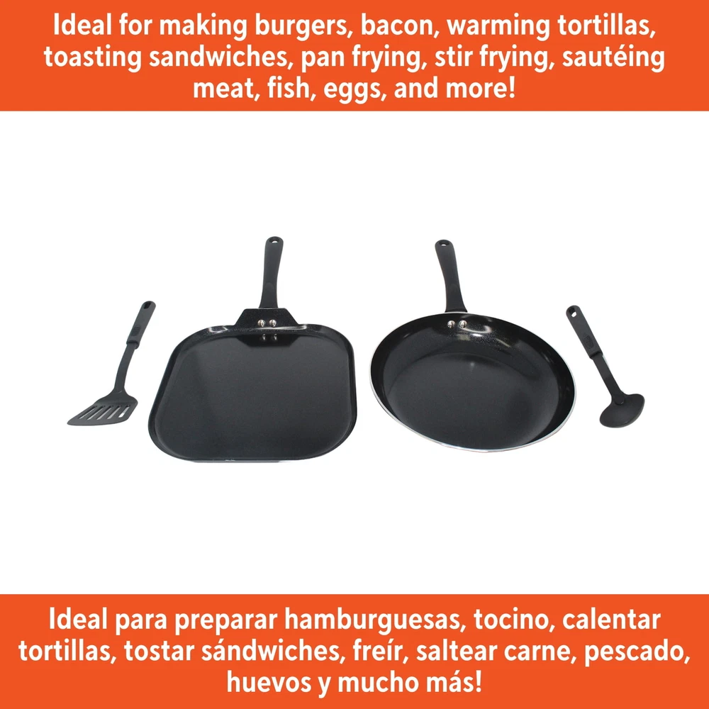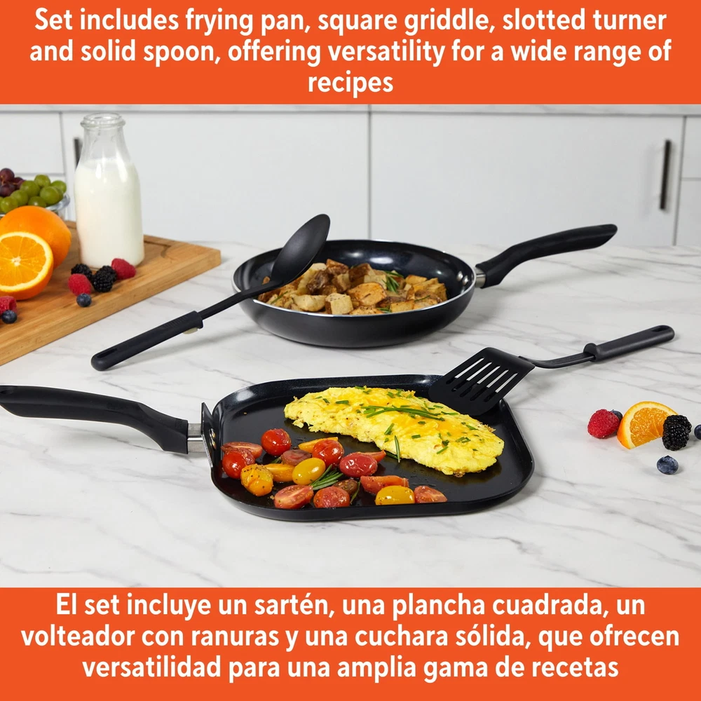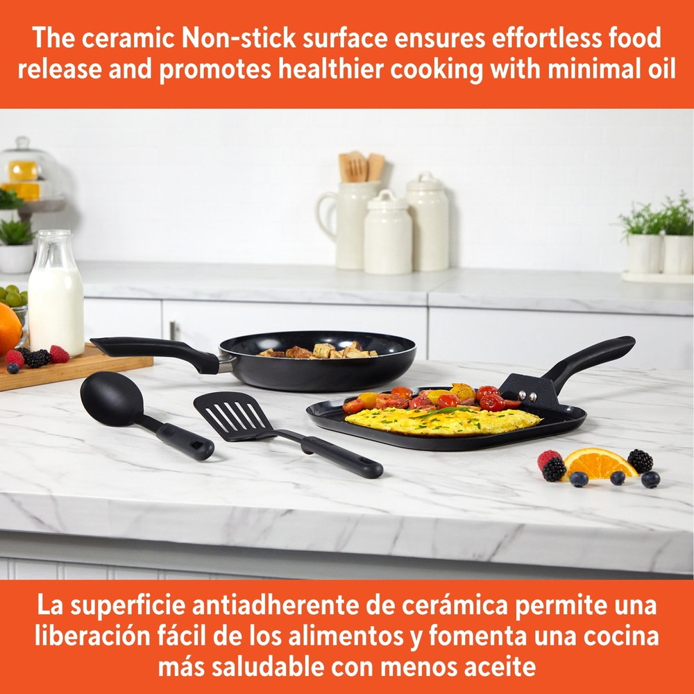 COOKING MADE SIMPLE: This 4-piece set includes a 10” fry pan and a 10.5” square griddle offering the right size for both small and large meals, perfect for preparing everything from simple dishes to more elaborate recipes with ease,STYLISH & SAFE: Made from aluminum with a black ceramic non-stick coating and a sleek black exterior, this set combines a modern look with durability and safe cooking for a healthier kitchen experience,MULTI-FUNCTIONAL SET: This set includes a fry pan, a square griddle, a slotted turner, and a solid spoon, offering versatility for cooking multiple recipes, from frying and sautéing to warming tortillas or toasting sandwiches, all with ease, About this item COOKING MADE SIMPLE: This 4-piece set includes a 10” fry pan and a 10.5” square griddle offering the right size for both small and large meals, perfect for preparing everything from simple dishes to more elaborate recipes with ease STYLISH & SAFE: Made from aluminum with a black ceramic non-stick coating and a sleek black exterior, this set combines a modern look with durability and safe cooking for a healthier kitchen experience MULTI-FUNCTIONAL SET: This set includes a fry pan, a square griddle, a slotted turner, and a solid spoon, offering versatility for cooking multiple recipes, from frying and sautéing to warming tortillas or toasting sandwiches, all with ease VERSATILE COOKING: Ideal for making burgers, bacon, warming tortillas, toasting sandwiches, pan frying, stir frying, sautéing meat, fish, eggs, and more, this set gives you the freedom to cook a wide range of delicious meals with ease EVERYDAY KITCHEN HERO: Perfect for daily cooking, this set is ideal for dry heat cooking like pan frying, sautéing, and grilling, providing the versatility and convenience needed for everyday meals IMUSA Nonstick Ceramic Cookware Set 4-Pieces, 10" and 10.5" Inches, with Stay-Cool Handles, Aluminum, Black The IMUSA 4pc White Ceramic Value Aluminum Cookware Set in Black is an excellent choice for anyone looking to enhance their kitchen with versatile and high-quality tools. This set includes two different-sized fry pans, along with a slotted turner and a solid spoon, providing everything you need for a variety of cooking tasks and easy serving. Each frypan features a natural nonstick ceramic coating, promoting healthier cooking with minimal oil and ensuring effortless food release and easy cleanup. The two fry pans of the IMUSA White Ceramic Value Aluminum Cookware Set are perfect for everyday home use and are ideal for a range of dry heat cooking techniques, including pan frying, stir-frying, and sautéing. They are well-suited for preparing meats, fish, eggs, and more, making it easy to cook a wide variety of meals. The included slotted turner and solid spoon add to the set’s versatility, allowing you to serve your dishes with ease and precision. The durable aluminum construction of the cookware ensures even heat distribution, helping you achieve perfectly cooked meals every time. The elegant black exterior and white ceramic interior give the set a modern and stylish look, complementing any kitchen decor. Whether you are preparing a simple breakfast or a complex dinner, the IMUSA White Ceramic Value Aluminum Cookware Set provides the tools you need to cook with confidence and ease, making it a valuable addition to any kitchen. Trust the IMUSA White Ceramic Value Aluminum Cookware Set for balanced, home-cooked meals. It will surely become your kitchen's beloved companion, uniting tradition, and innovation in every delectable creation and elevating your culinary experience. On Jun 16, 2025 at 19:59:27 PDT, seller added the following information: