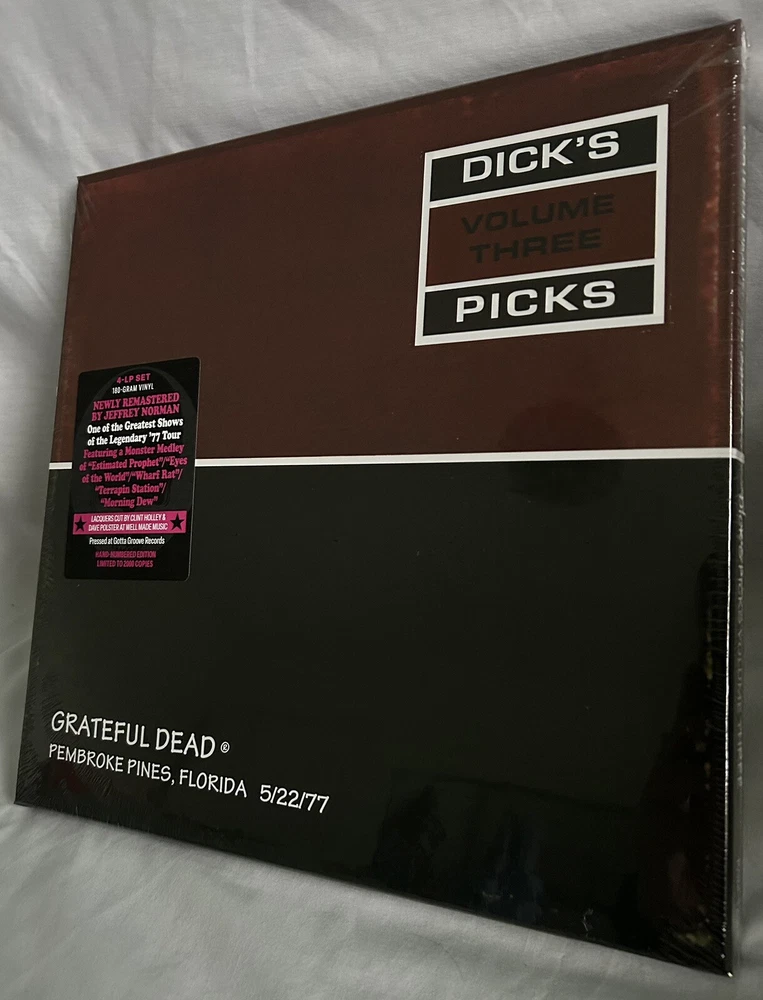 BRAND NEW ✅ EXCELLENT CONDITION ✅ SPEEDY SHIPPING ✅ HAPPY TO SHIP SECURELY OVERSEAS ✅ Very low number 63/2000 GRATEFUL DEAD: Dick’s Picks Vol. 3—Pembroke Pines, Florida 5/22/77 (Limited, Hand-Numbered, 180-Gram 4-LP Set) Grateful Dead archivist Dick Latvala considered this show to be the finest outing on the entire Spring 1977 tour, and, as any Dead Head knows, that is high praise indeed! At the time this was released on CD, the Dead weren’t sure a market existed (ha!) for three and four-CD packages, so this four-LP set leaves off eight songs from the show, but consider what songs are here: a phenomenal “Help on the Way”/”Slipknot!”/”Franklin’s Tower” comes after one of the definitive renditions of “Sugaree” and a terrific “The Music Never Stopped,” with the late, great Phil Lesh’s slithering bass leading the way in recording engineer’s Betty Cantor-Jackson’s mix. But sides E, F & G offer one of those sublime (and, in this case, never to be repeated) sequences of songs that only the Dead could pull off in concert; after the rarely-performed “Sunrise,” a medley of “Estimated Prophet”/”Eyes of the World”/”Wharf Rat”/”Terrapin Station” (a truncated version two months before its official release)/”Morning Dew” brings the show home, as Jerry Garcia’s soloing on “Morning Dew” reaches heights seldom attained even by him. This was a knockout release on its first very limited vinyl run (check out those resale prices), and we’ve improved on it with a fresh mastering job by Jeffrey Norman (in his own words, “the sound is better than the original heard on the Brookvale release”), and lacquer cutting by Clint Holley and Dave Polster at Well Made Music. Pressed on 180-gram black vinyl at the plant we’ve been using to great acclaim for all of our Grateful Dead releases, Gotta Groove Records, and limited to 2000 hand-numbered copies! Songs: LP ONE SIDE A Funiculi Funicula The Music Never Stopped Sugaree SIDE B Lazy Lightning Supplication Dancin’ in the Streets LP TWO SIDE C Help On The Way Slipknot! SIDE D Franklin’s Tower LP THREE SIDE E Samson and Delilah Sunrise Estimated Prophet SIDE F Eyes of the World Wharf Rat LP FOUR SIDE G Terrapin Station (Walk Me Out In The) Morning Dew