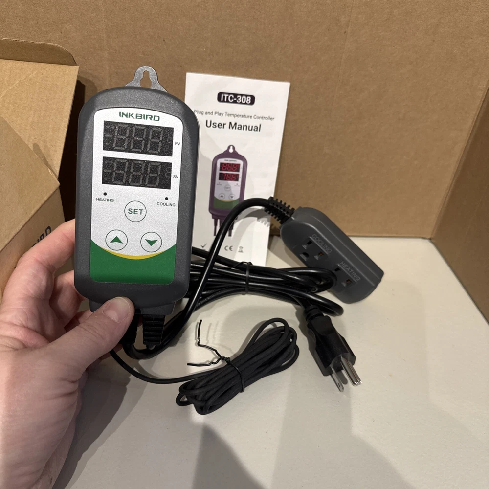 The INKBIRD ITC-308 Temperature Controller is a digital thermostat designed for heating and cooling systems. It has a temperature control range of -50~120 °C / -58~248 ° F with a resolution of 0.1°C/0.1°F and an accuracy of ± 1°C(-50~70°C)/ ± 1°F(-50~160°F). It features a 2-stage outlet switching for heat-cool-on/off and has a maximum output of 10A, 100V ~240VAC. The thermostat has a green color and is made of metal probe and plastic. It is programmable and has a manufacturer warranty of 1 year.