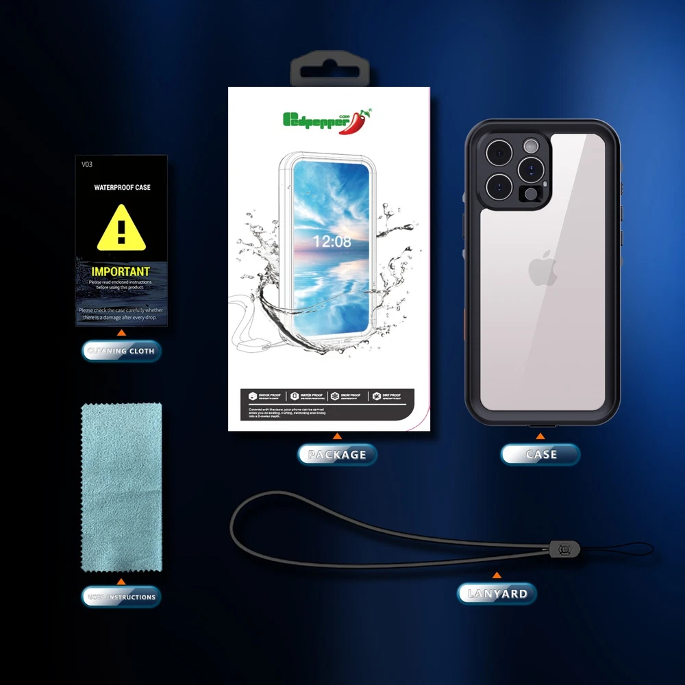 IP68 Underwater Full Body Waterproof Shockproof Case For iPhone 16 15 14 Pro Max + Note: The pictures shown are as samples, while the item delivered to you will be the same as your chosen model. If there are any problems when you receive the package, please contact us before leave any feedback.We will solve it for you patiently. Feature: 1-IP68 standard waterproof case, This waterproof case designed for underwater and tested to submersible to 10ft/3 meters and 6.6ft/2 meters deep for 30 minutes. shockproof/snowproof/dustproof. 2-Gives you enough confidence, protect your phone from shock and drop. Keep no screen protective film on your phone because the case comes with a screen protector. 3-Use the camera well and shoot beautiful photos and videos in high definition. 4-This waterproof case supports wireless charging, which ensures that your phone could charges quickly without removing your waterproof case. Easy to Install 1-Please remove the screen protector from the phone before installing this waterproof case, which will compromise the touch sensitivity and keep the case from being closed completely. 2-Please follow the instruction and install this case correctly. Make sure all the hole and thin seam-sealed tight. 3-Please do a water-test before installing the phone into this waterproof case. Ensuring that all the ports have been completely sealed. Package Included: 1 x Waterproof Case 1 x Cleaning Cloth 1 x Lanyard 1 x User Manual