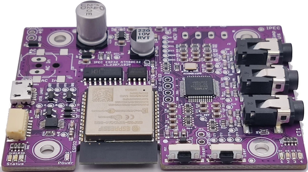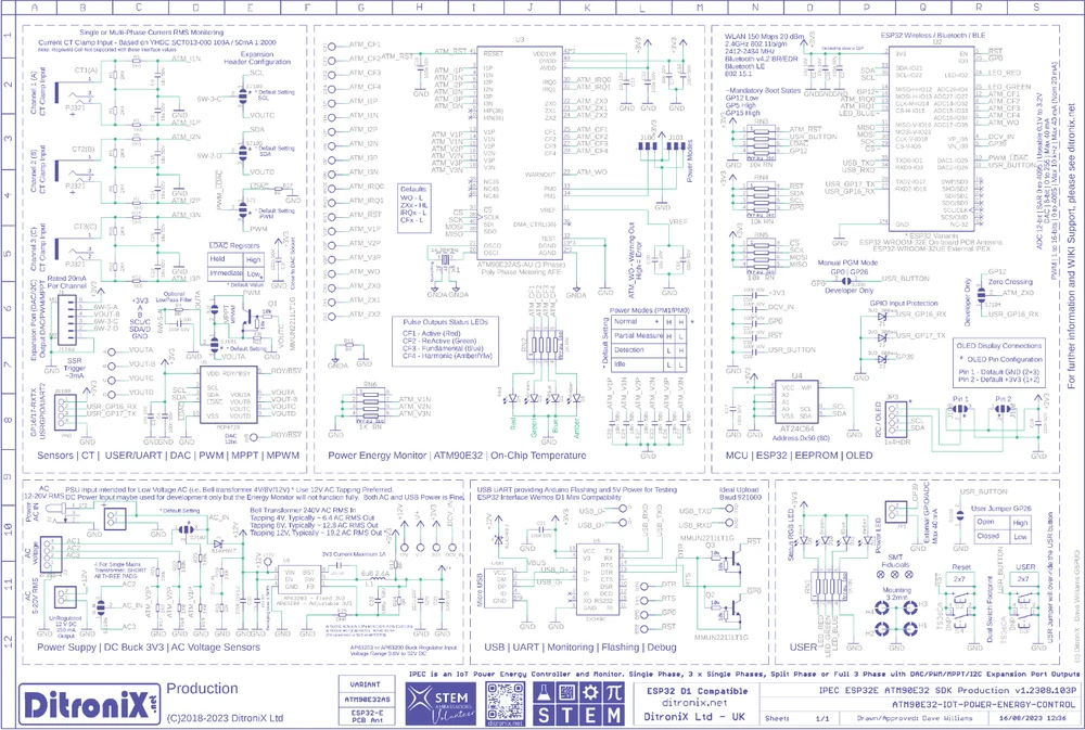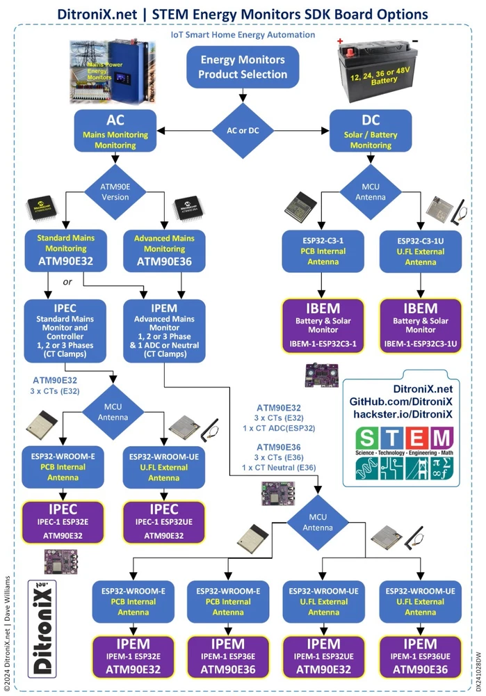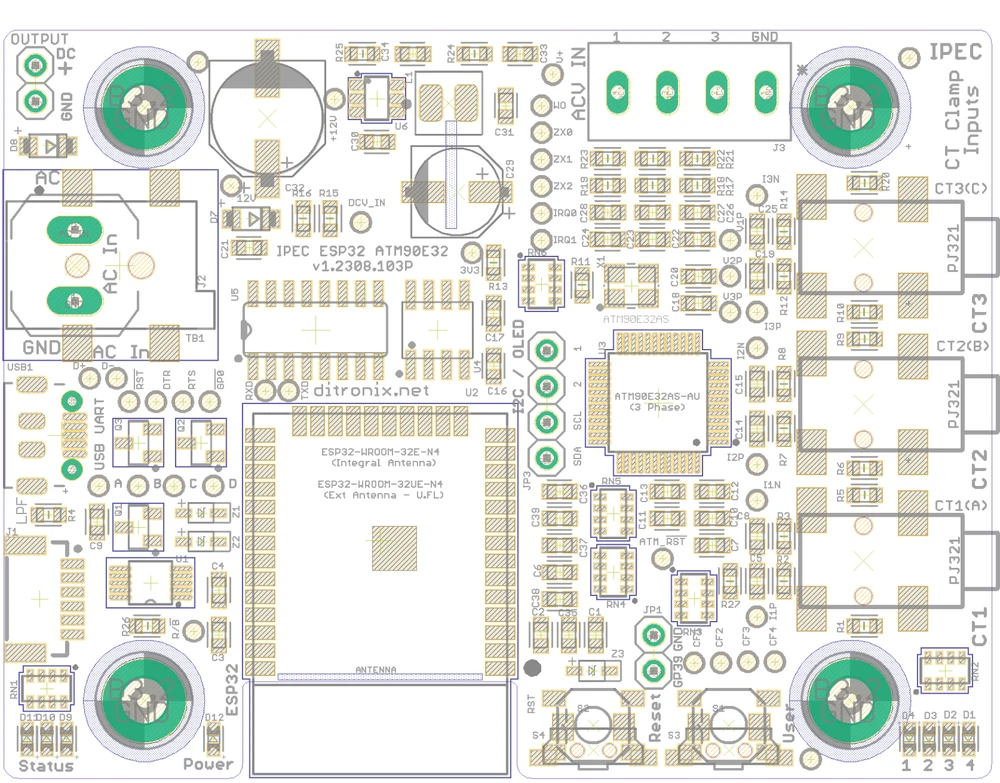 IPEC, IoT Power Energy Controller and Monitor, is a 3 phase (or 3 x 1 phase), High-performance Mains Electricity Power Energy Monitor SDK board, designed for Home Automation . This product is the version of the board with an Espressif ESP32E (Internal PCB Antenna) , an ATM90E32 Energy Monitor and a MCP4728 DAC A Separate IPEX Expansion Board is available, which allows both DAC and ADC Connections. Antenna As shown in the above table, IPEC board Antenna options include: ESP32E – Internal Wi-Fi/BT antenna (on the ESP32) ESP32UE – External Antenna (via U.FL). The external antenna option will extend the Wi-Fi range if required, or where the IPEC board is housed in a metal enclosure. On the external antenna boards, use is made of the U.FL connector on the ESP32-WROOM-32UE-N4 . An example of the folded external antenna is shown the photos. Board Feature Overview Further details can be found on this expanded comparison chart. Current Clamp Inputs IPEC has three main CT Clamp inputs, for Current Measurement Options: 3 x Single phases (such as Mains In, Solar Inverter, Power Circuit etc.) Full Three Phase (3φ. Voltage on each phase is 120 degrees phase shifted, relative to each of the other phases) Split Phase (Dual Phase A and B. Such as USA 2 x 120V) The board has three, or four, standard 3.5mm sockets fitted, so the CT clamp can just plug in. Solder pads are also provided on each current clamp input, where the 3.5mm connection is not available. Burden resistor can be optionally enabled via a solder pad (Not needed for Standard Measurements) Example of CT clamp are the popular split-core YHDC SCT-013-000 (using a standard 3.5mm mono jack plug). Voltage Inputs IPEC has three voltage inputs for safely monitoring mains voltages. This achieved using a voltage derived from a SELV / Wall AC/AC Power Supply. Voltage Inputs. You can use a single voltage, or multiple voltages input. Three solder pads are provided, with a common ground. Solder Options DAC On-board MCP4728 DAC 12bit – 4 Channels Modulated PWM Output Expansion Port I2C and Two channels DAC or PWM Output IPEX Expansion Board Interface JST 6W SH Header Board Power IPEM has an on-board SMPS DC Power Supply, which is derived from the AC Power Input, via an AC terminal block / solder pad, for normal operation. This achieved using a SELV, Wall AC/AC Power Supply. The supply needs to be 8 to 12 V AC RMS – Ideally 12V. Examples of a suitable Low Voltage 4 to 12V AC power supplies are bell transformers such as the TR7 , Byron Din Rail , or DATA01A Transformer . These may vary in different countries but local sourcing should be straight forward. Flashing and Code The IPEM board has a complete Wemos D1 ESP32 Mini compatible interface. Allows ease of interfacing such as from Arduino IDE and Platform IO. The USB input (via Micro USB), can also power the board when developing code. The board can safely have both USB power and AC Power at the same time. EEPROM On-board 24C64 EEPROM 64-Kbit (8K x 8 bits) Easy storing of parameters, Logs etc. Accessible using standard I2C EEPROM library OLED Display Should you wish to add a display to the IPEM board, a four pin header is provided. Power pins are configurable for pin 1 and 2. Board Configuration Solder configuration pads are provided on the bottom of the PCB. Specification of IPEC/IPEX Family The IPEC board is suppled fully tested. You will require to flash your specific code, or from our examples on GitHub The IPEC IoT Power Energy Controller board main features: Compact and Flexible Design SDK Board All connections are low voltage , for safe operation Easy to interface Optional Espressif ESP32 WROOM ESP32-WROOM-32E-N4 Integral Antenna Wireless and Bluetooth ESP32-WROOM-32UE-N4 Ext Antenna – U.FL Socket Wireless and Bluetooth ATM90E32 Energy Monitor 3 x Phases Line CT Clamp Input Example YHDC SCT013000 3 x Voltage Sensing Inputs (AC RMS) Can be used with Single Phase, or Multi AC Inputs (For Split or 3Phase) Normally Taken from AC Power Input (by Default) Power Modes Settings MCP4728 DAC 12bit I2C DAC Four Independent Buffered Output Channels Configured for Default DAC Out, or Modulated (Example MPPT) Configurable Solder Pads On-Board DAC EEPROM (For DAC Codes and Addressing) Can be configured to drive DAC based on CT Clamp Current / Power 24C64 EEPROM I2C Parameter Settings Logging OLED I2C I2C Interface OLED I2C Connector Configurable Power Pins AC Low Voltage Input (for Safety) Standard 2.1mm Jack Socket Power safely derived from a SELV / Wall AC/AC Power Supply 8 to 12V AC RMS (Nominal 12V) Examples GreenBrook DAT01A or TLC TC TR7 Onboard 3V3 DC SMPS Power Supply Power taken from AC Input, or USB 5V Arduino Wemos D1 Compatible USB Interface On-board Micro USB Socket Flashing and Programming Example wemos_d1_mini32 Can also used to power the board Debugging Expansion Port Configurable and Flexible Port DAC Outputs I2C Interface 3v3 Power Standard JST SH 6 Way Header USER GPIO/UART 2 GPIO for User (GP16 and GP17) UART Interfacing (UART 2) Reset Button User Programmable Button RGB Status LED User Configurable Power LED On 3V3 ATM CT LEDs CF1 – Active CF2 – ReActive CF3 – Fundamental CF4 – Harmonic Configuration Solder Pads on Rear of PCB. PCB designed to fit neatly into an BMC enclosure Also allows for the display to be included, or not. Firmware – Code Full Example Code in GitHub Source Code Based on IPEM Publish to MQTT Publish to Domoticz Publish to ThingSpeak Drive DAC for PWM / Voltage or MPPT Based on CT Readings Size 70 mm x 53 mm In the Box IPEC ATM90E32 ESP32E board – PCB Antenna Version You will need to update the firmware with your preferred open source firmware, using a standard micro USB cable (not included). Working examples of test code can be found in our Wiki and GitHub 1 x IPEC-1 ESP32E Board SMD (Surface Mounted Components) Populated. Fully Tested 2 x Terminal Blocks (2 Pin and 4 Pin – Not Soldered) 1 x Strip of straight pin header 1 x 4 pin header socket (Not S