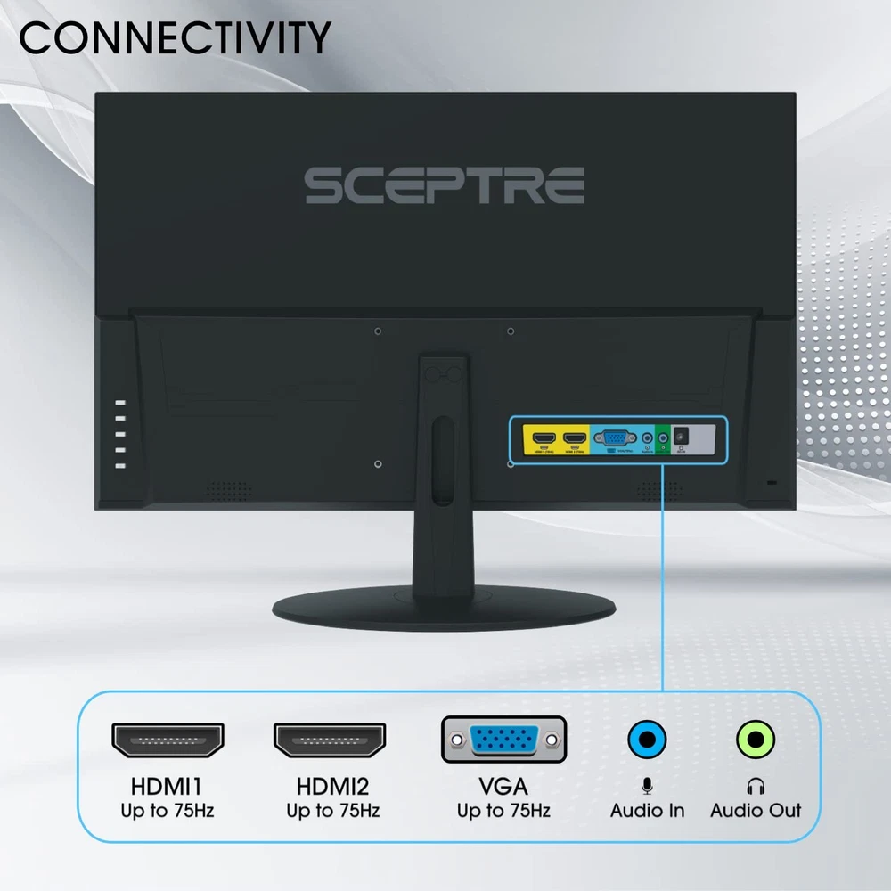27" LED Monitor 1920 x 1080 Full HD Resolution IPS Panel Up to 75Hz Refresh Rate Fast Response Time Wide Viewing Angles Wide Viewing Angles: Wide viewing angles keep all the action sharply in sight from almost any viewing position while gaming on large monitors or dual-display setup. Fast Response Time: Playing fast action games and watching action adventure movies always require fast and accurate pixel response from an LED. With quick response times, ghosting and blurring are reduced so the user can enjoy the display with clarity and precision. Multiple Ports: Two HDMI ports and one VGA port provide up to 75HZ refresh rate, refining picture clarity in all action-packed gaming sequences and graphic design projects. Audio In and a Headphone Jack provide diverse audio options. Edgeless Design: Edgeless Design completely immerses you in all the captivating action and wondrous scenery that 1080P resolution and 75Hz refresh rate have to offer. 99% sRGB Color Gamut: With 99% sRGB, our display reveals an astonishing brightness and variance in red, green, and blue color across a wide gamut, providing a more defined and naturalistic display of color in every image. Blue Light Shift: Reduce your monitors blue light to protect you from eye fatigue, irritation and strains. This enables you to work on your documents, watch movies, or play games more comfortably for extended periods. Anti-Flicker: Provides a crisper picture by preventing the backlight from flickering periodically.