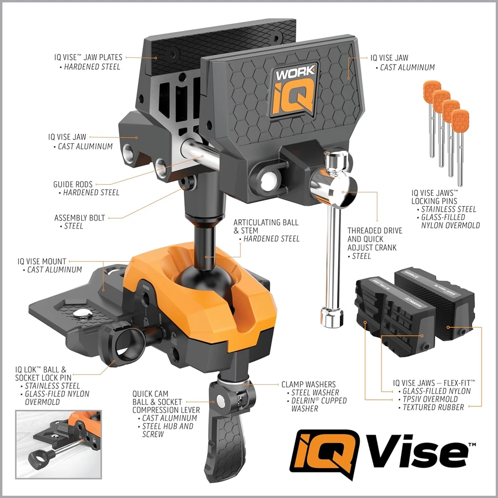 Store New Arrivals Add to Favorite View Feedback Contact IQ Vise | 360° Articulating Bench Vise Made from Steel & Cast Aluminum W/ 8-Position Locking Ball & Socket | Woodworking Vise Handles up to 130Ft-Lbs of Torque | Pipe Vise with Double Sided Jaws Description Item model number IQVISE Item dimensions L x W x H 11.42 x 13.13 x 9.25 inches Color Multicolor Brand WORK IQ TOOLS Material Hardened Steel, Cast Aluminum Style Multipurpose, Articulating, Versatile Item Weight 10 Pounds Batteries Included? No Batteries Required? No Included Components Four Jaw Locking Pins, Three 1/4"-20 x 2-1/4" Carriage Bolts, Washers and Nuts, Bench Vise, Flex-Fit Jaws Product Dimensions 11.42 x 13.13 x 9.25 inches Manufacturer Work IQ Tools ✔【Hardened Steel & Cast Aluminum Construction 】Our IQ Vise is made out of high quality materials that guarantee long-lasting performance. Hardened steel components ensure strength and resilience under pressure while cast aluminum offers lightweight portability without compromising on sturdiness. You can trust IQ Vise to withstand rigors of the workshop, ensuring years of dependable service ✔【Articulating 360º Movement 】The articulating ball of the IQ Vise offers infinite positioning, ensuring you always have the perfect angle for any project, from intricate wood carvings to robust pipe work. The Quick Cam feature allows for easy locking and unlocking at any angle, ensuring you can position your work securely, where you need it ✔【Up to 130ft-lbs of torque 】Our bench vice features 8-position locking ball and socket which allows IQ vise to handle high torque applications maintaining stability and precision ✔【Optimal gripping performance】Our table vise includes double-sided IQ Vise Jaws — Flex-Fit, featuring textured rubber for a firm grip on wood and flat objects on one side and rubber grooves and angles on the reverse side for securing pipes and materials of various shapes and sizes ✔【Compatible】With system of task-specific IQ Vise Jaws and IQ Connect hands-free accessories. The IQ Vise allows you to connect a Work Light, Magnifying Glass, and even a Cell Phone Holder, ensuring you have all the help you need within reach ✔【Unmatched Versatility】IQ vise offers unmatched versatility, making it a must-have for your home improvement projects. Whether you need a pipe vise, wood vise, or bow vise, this tool fits your needs perfectly Product Description Work IQ Vise - The world's most versatile vise Unleash creativity and potential with this versatile vise With its articulating ball and socket design, the IQ Vise both articulates and rotates, allowing the user to find the perfect position to complete a task. When working on tough jobs that require a lot of force, the patented IQ Lok pin can be inserted in 8 different working positions, preventing movement during projects requiring a high-torque value, up to 130 ft-lbs. Compatible with system of task-specific IQ Vise Jaws and IQ Connect hands-free accessories that will transform your workshop and become a capable and versatile project partner. No limits Ultimate versatility IQ Vise offers infinite positioning, ensuring you always have the right angle for any project Downward positioning Easily position vise & object downwards for optimal leverage Articulating Ball IQ Vise makes completing hundreds of jobs faster and easier Find your perfect angle Maintain stability and precision regardless of the angle you choose to lock the vise in Quick & Secure Positioning IQ Lok Intersects and locks the ball and socket joint in place to provide added stability during projects 130 ft-lb of torque IQ Vise has ability to handle up to 130 ft-lb of torque in one of 8 locking positions Quick Cam Ball & Socket Compression Lever Intersects and locks the ball and socket joint in place to provide added stability during projects Allows for easy locking and unlocking at any angle Quick Adjust Crank Helps clamp objects in place quickly & safely Multi-Use Jaws 8-Groove rubberized surface Provides an enhanced grip on tubular shapes ensuring stability and precision in every task Non-Marring Textured Rubber Perfect for securely gripping flat and delicate materials without causing any damage Easy installation Our 2-in-1 reversible jaw sleeves can be easily installed on the vise based on your projects needs Magnet-Friendly Steel Jaw Plates Enhance your grip on a variety of materials, ensuring your workpiece stays firmly in place, no matter the complexity of the job Add to Cart Add to Cart Add to Cart Add to Cart Add to Cart Customer Reviews 5.0 out of 5 stars 5 5.0 out of 5 stars 3 5.0 out of 5 stars 3 5.0 out of 5 stars 3 5.0 out of 5 stars 3 Price $109.99 $ 109 . 99 $44.99 $ 44 . 99 $44.99 $ 44 . 99 $39.99 $ 39 . 99 $24.99 $ 24 . 99 Upgrades for IQ Vise 180 Lumen Work Light, 5-Inch Magnifying Glass and Cell Phone Holder Crafted for fine wood and delicate items Great for securing PVC, cast-iron, copper, or aluminum pipes and tubes Expanded capability for maximum performance on wood Designed for odd-shaped parts and flat or delicate items ABOUT US We offer the best prices around on high quality products. Our E-store includes media such as books, movies, music and games while offering electronics, toys, sporting apparel, clothing, tools, general home, garden items and more. SHIPPING We are always working hard to ensure your package arrives as soon as possible. Please understand that some factors like weather, high postal traffic, and the performance of shipping companies are outside of our control. For shipping outside of the continental USA, we only use eBay's Global Shipping Program.The item is shipped to KY and then sent to the rest of the world. International customers are responsible for all duties and taxes. Continue to check out in order to calculate costs for shipping the item to your country. Messages regarding eBay's Global Shipping Program MUST be directed at eBay EXCLUSIVELY. RETURNS We offer a 30-Day Return Pol