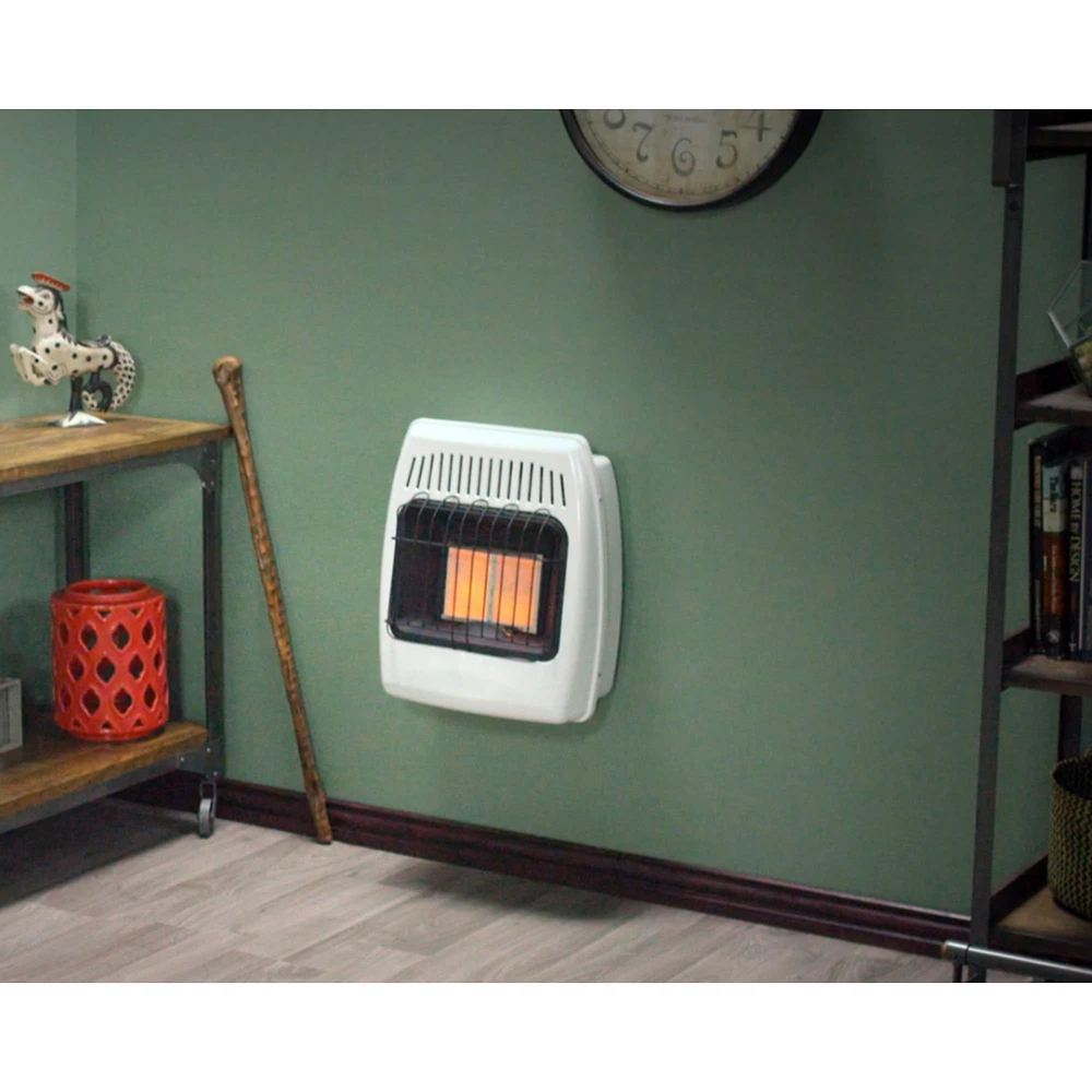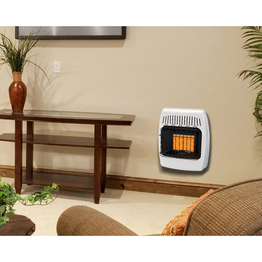 Dyna-Glo wall heaters are the ideal choice for safe, indoor supplemental heating.This state-of-the-art vent free technology does not require a flue or chimney. These heaters are great for use in your home, cabin, or garage. Since these heaters do not require electricity to operate, they make an excellent choice for everyday heating, and emergency situations when the power goes out. Using infrared heating technology, objects are warmed first similiar to how the sun heats & feels. This Infrared Wall Heaters burn with 99.9% efficiency, and operates on Natural Gas only. Not for sale in California or Canada. Check your local regulations on installation restrictions and requirements. DEPENDABLE Ideal for daily supplemental or emergency use, such as power outages ECONOMICAL Cut heating bills by warming only occupied areas COMFORT Manually adjust the heat setting to your desired temperature SAFE Built-in oxygen depletion sensor (ODS) immediately shuts down the heater if carbon monoxide or lack of oxygen is detected CONVENIENT One continuous press of the battery assisted igniter makes ignition quick & effortless VERSATILE Includes all necessary hardware & bracket for wall mounting UPGRADEABLE Separately sold optional base legs (WBL100) provide the alternative of floor mounting. Separately sold optional Wall Heater Fan (WHF100) distributes heat in a quiet, yet powerful way. Natural Gas Ready (Fuel conversion not permitted) Infrared Technology works by radiating heat to warm objects first - Similar to the sun,Up to 12,000 BTU's/hr heats up to 300 sq. ft. LOW-HI variable control knob offers the most customizable heat settings,No electricity required allows for reliable back-up heating incase of an emergency situation Separately sold optional fan (WHF100) improves the amount of square footage the heat reaches in a quiet, yet powerful way. Separately sold optional base legs (WBL100) allows for stable floor mounting 1 Year Warranty